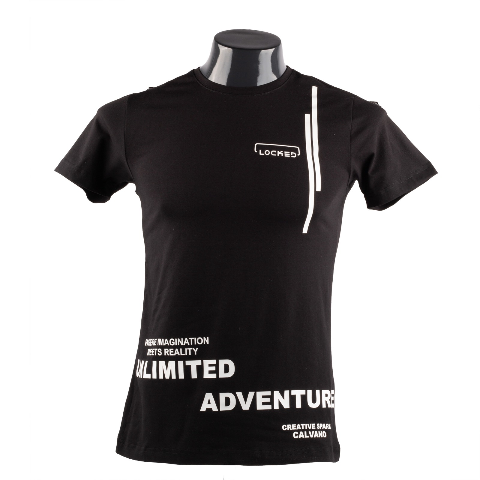 men’s black T-shirt with Locked Unlimited Adventure design