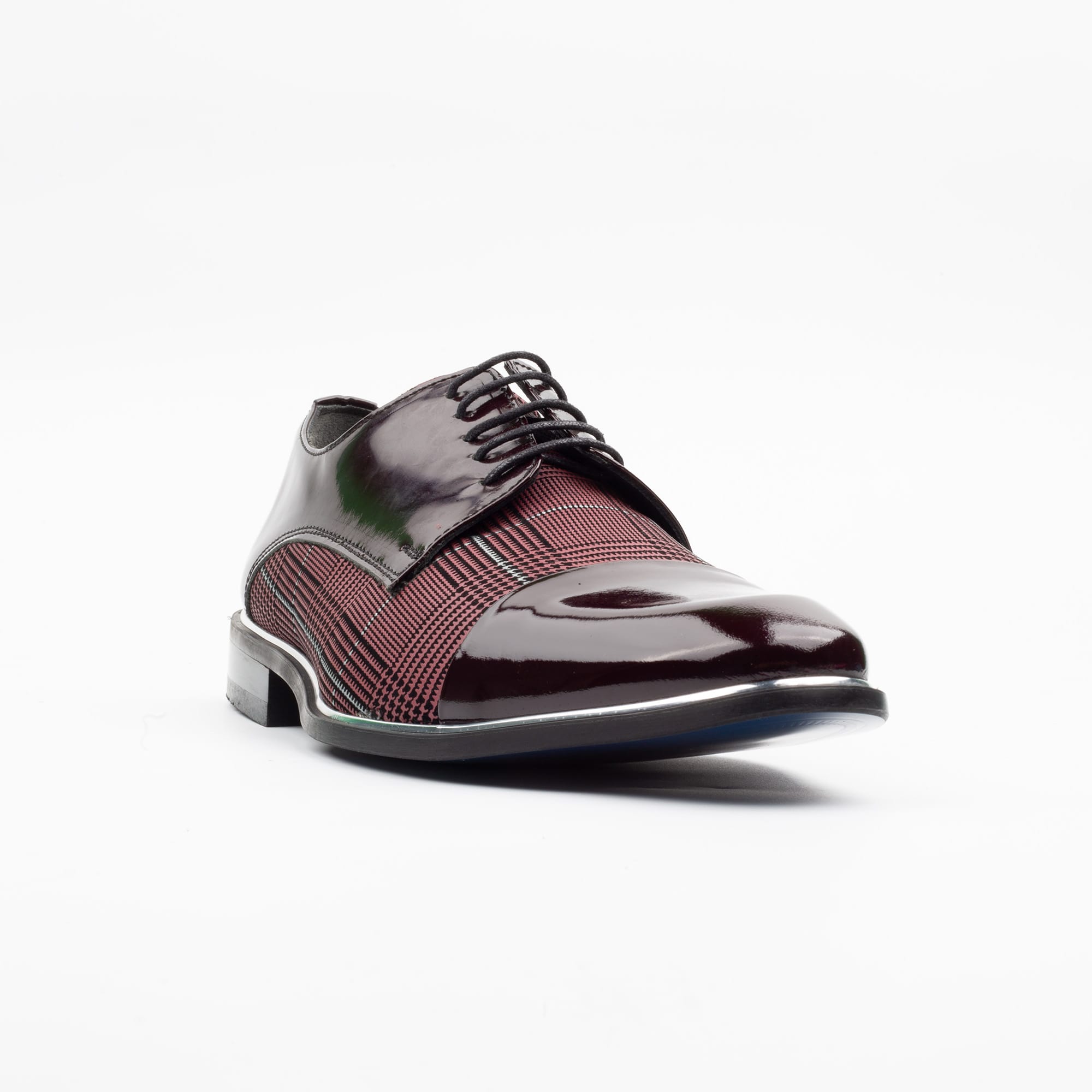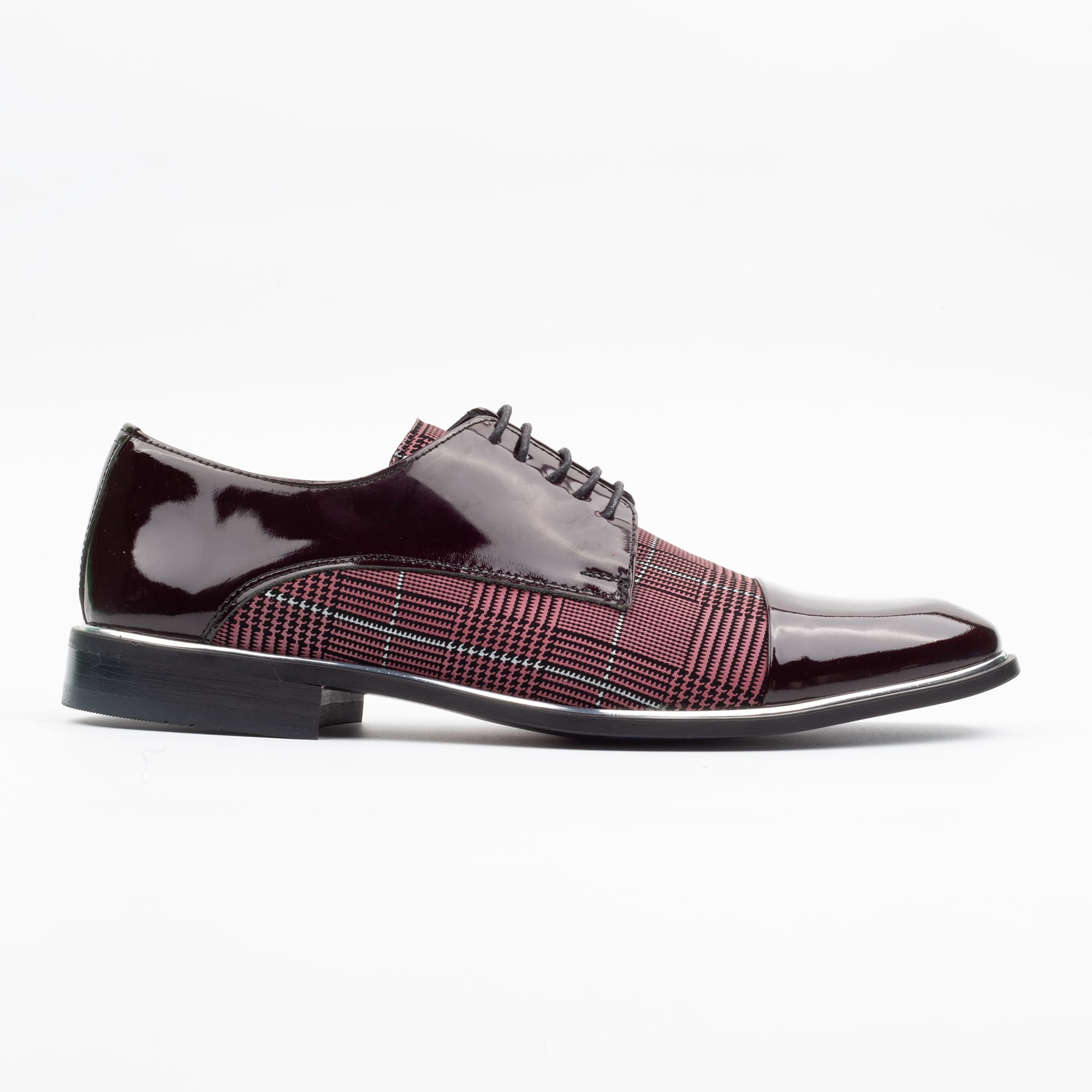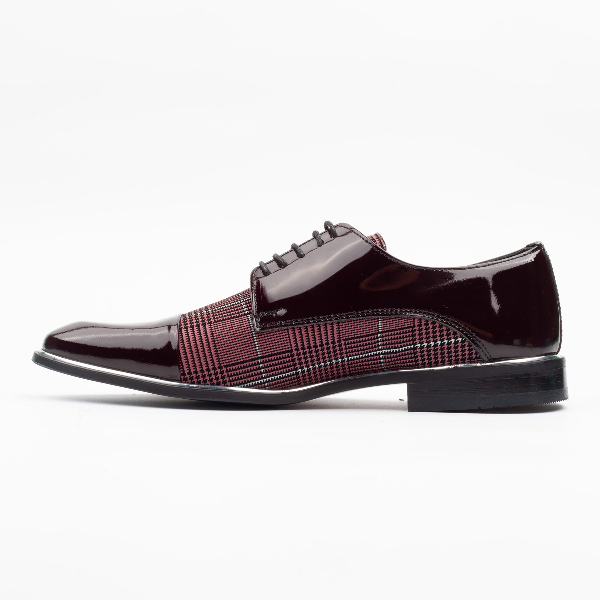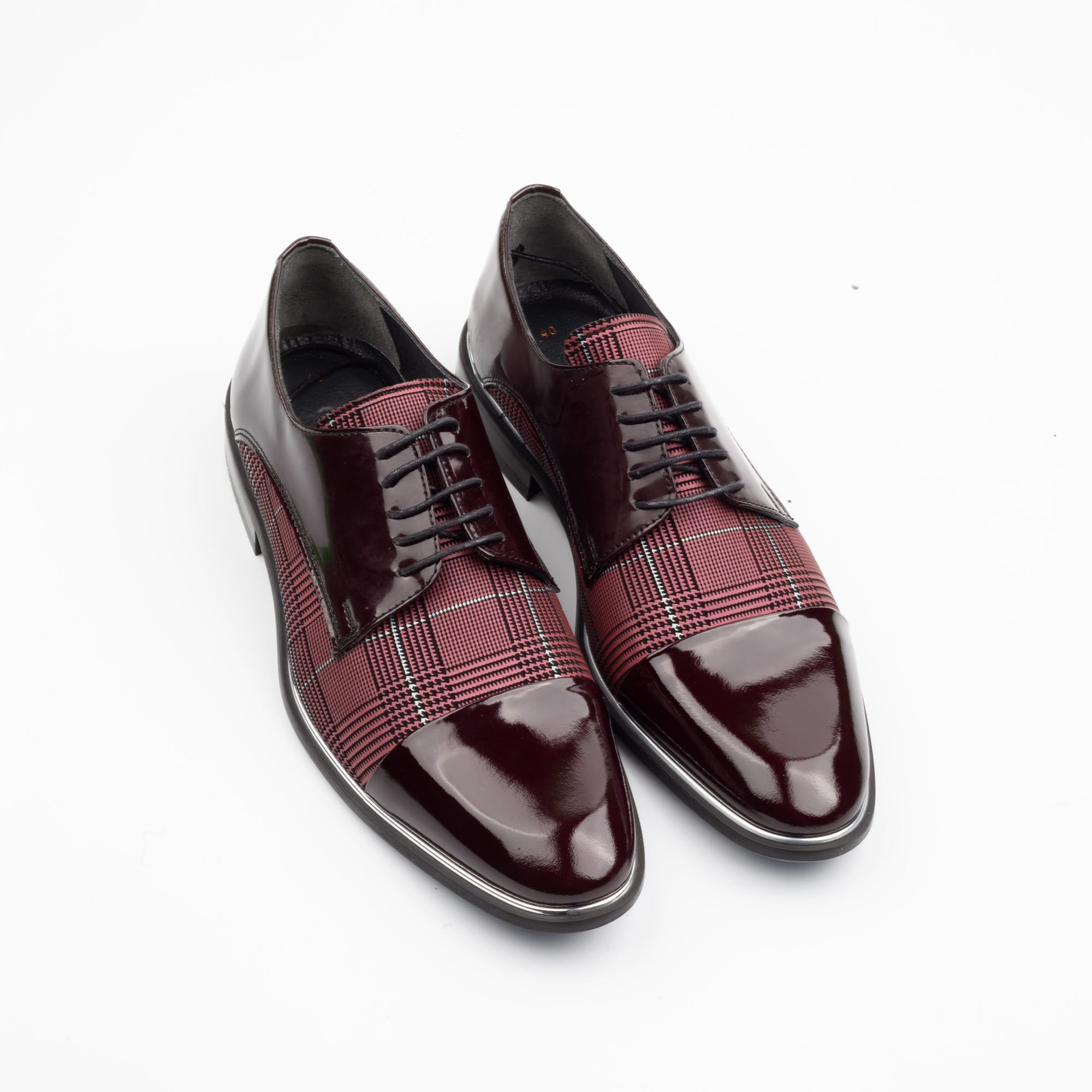 Burgundy Plaid Oxford Shoes are the perfect fusion of classic elegance and modern flair. These shoes are crafted for the man who wants to stand out in any formal setting while maintaining a sophisticated edge. The unique burgundy plaid pattern on the cap and body of the shoe provides a striking contrast against the glossy patent leather, making these shoes a statement piece in any wardrobe.