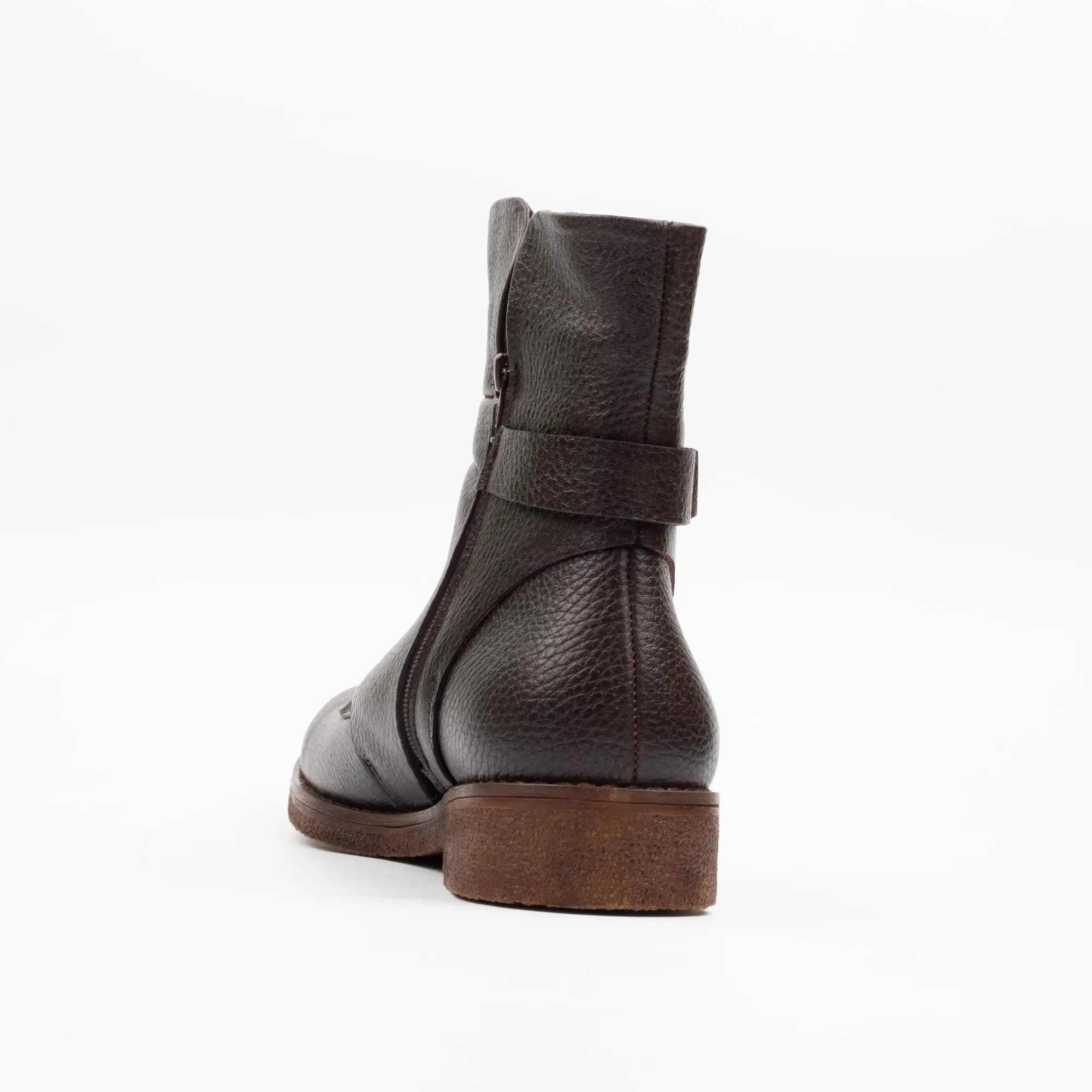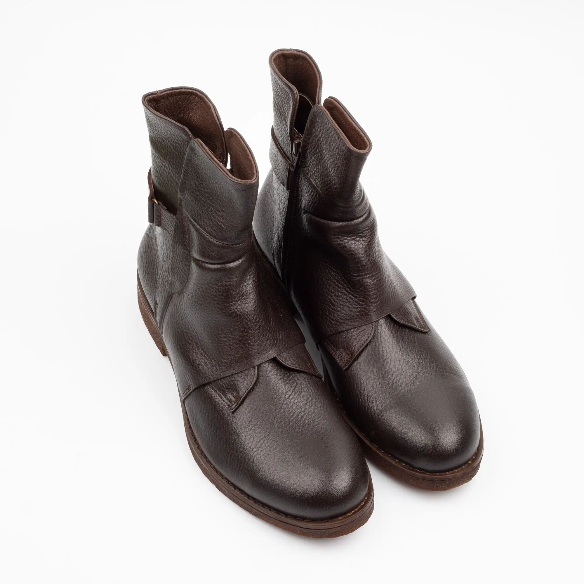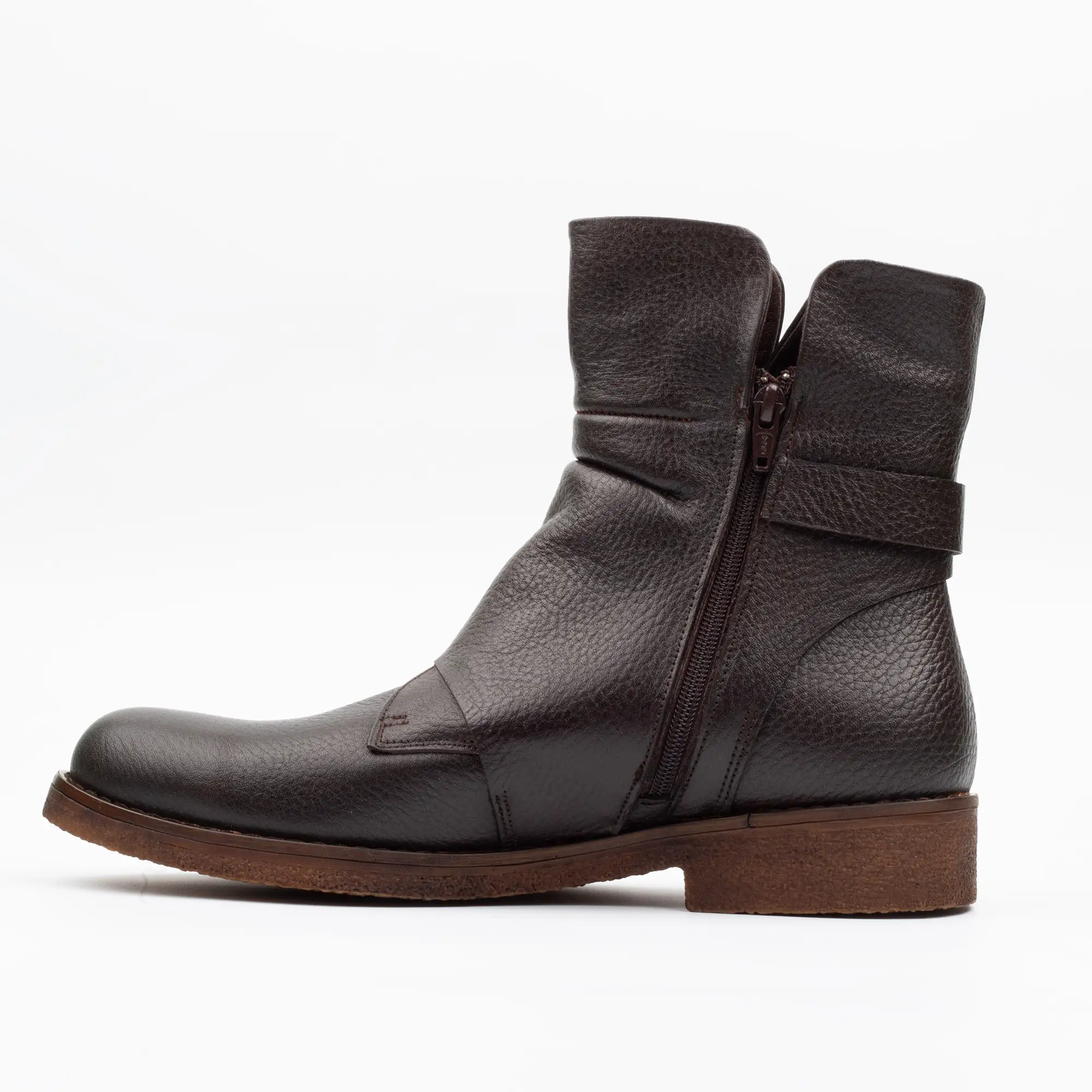 The Calvano Brown Leather Ankle Boots represent a pinnacle of footwear engineering, utilizing premium hides that showcase a natural, pebbled grain. The deep espresso hue provides a versatile foundation for both tailored trousers and high-end denim. The design incorporates a subtle wrap-around detail secured by a metallic buckle, offering a bespoke fit around the ankle while maintaining a streamlined profile.