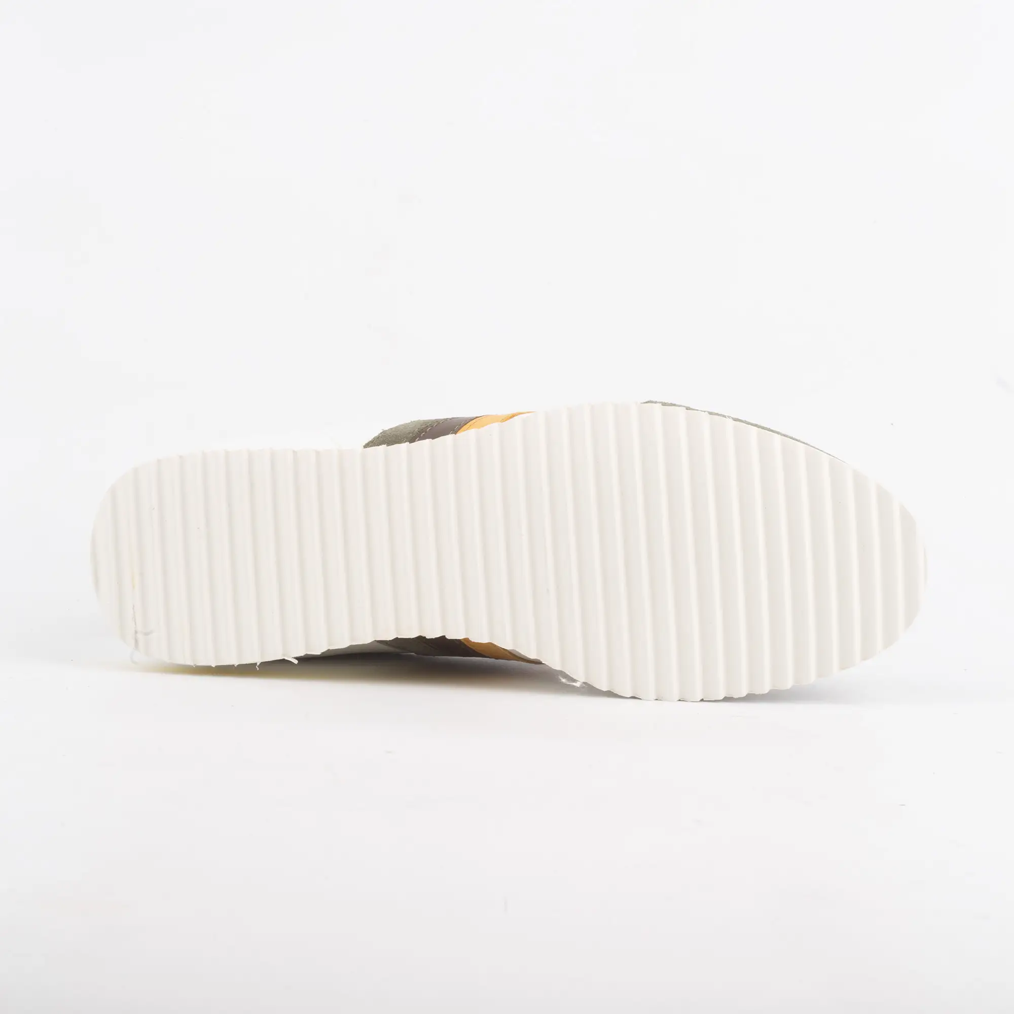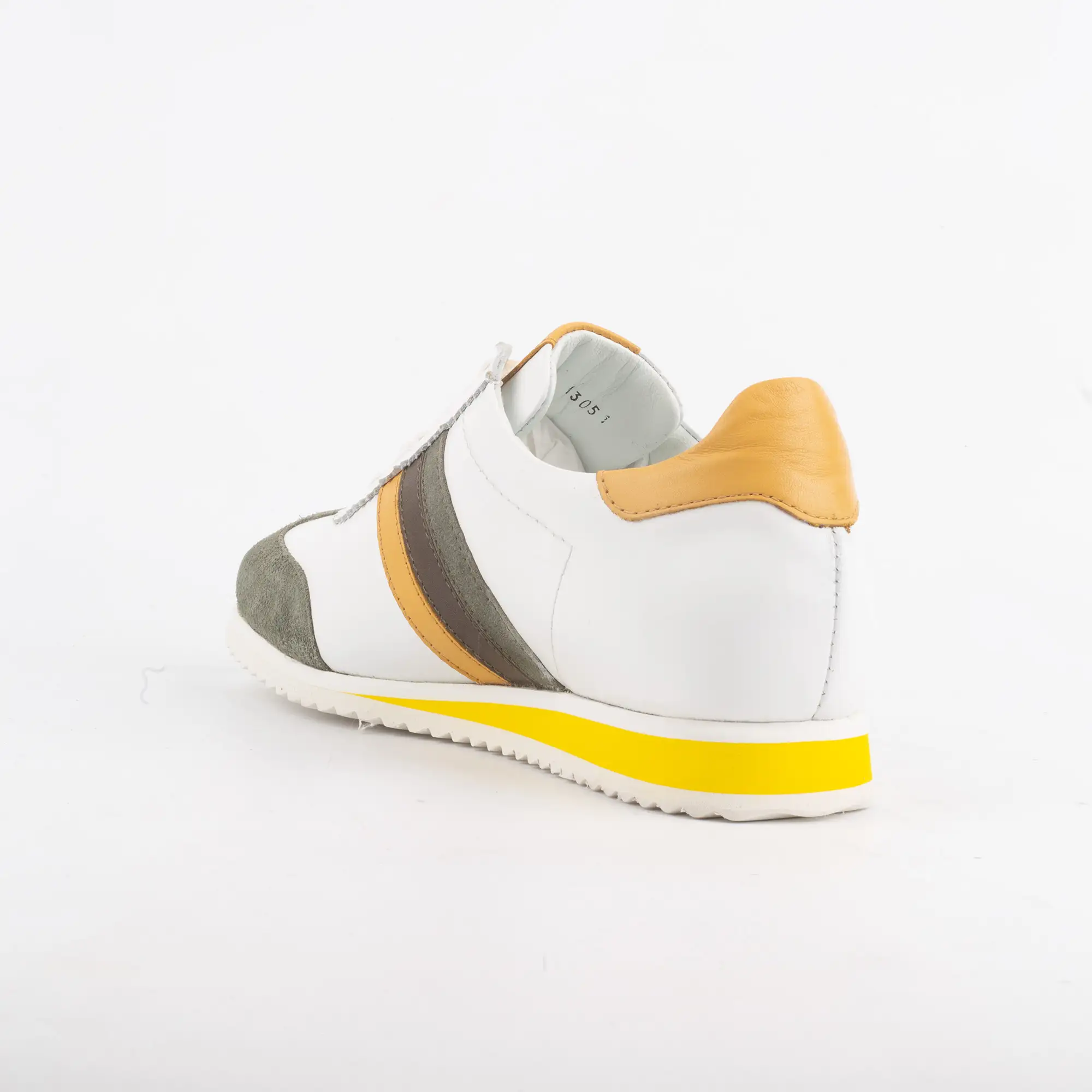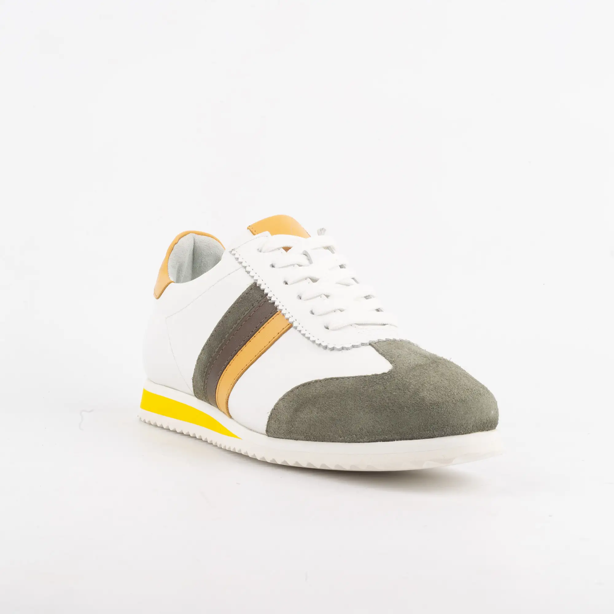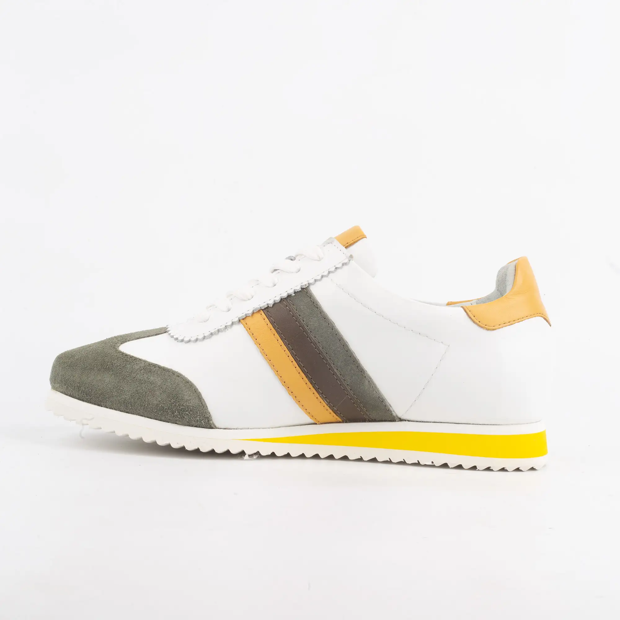 These Calvano leather casual sneakers aren’t just basic trainers; they are a masterclass in texture. The olive-grey suede toe cap adds a rugged edge that protects the front from scuffs, while the mustard yellow accents on the heel and tongue give you that pop of color needed to stand out in a crowd. Look closely at the side: the triple-stripe detail in suede and leather adds a retro-sporty feel that pairs perfectly with chinos or your favorite denim.