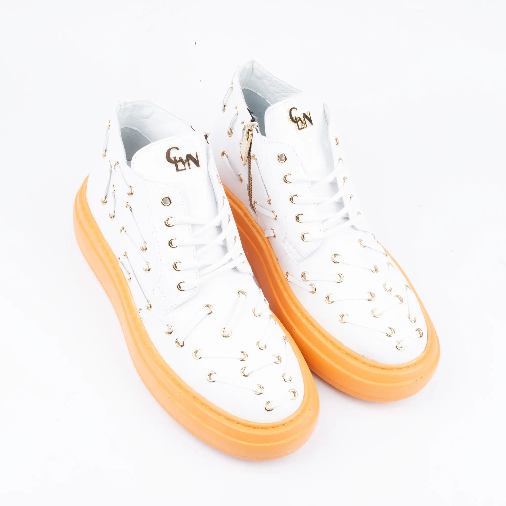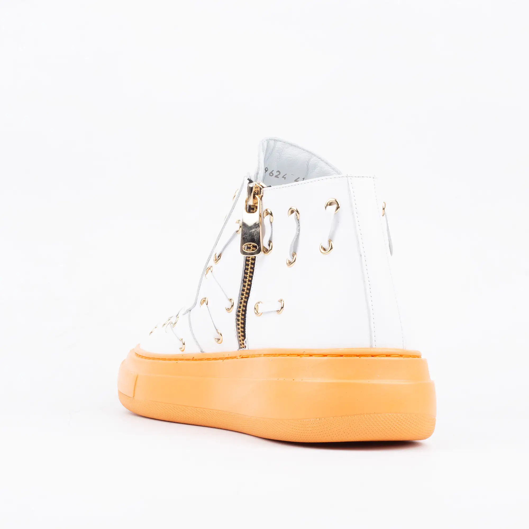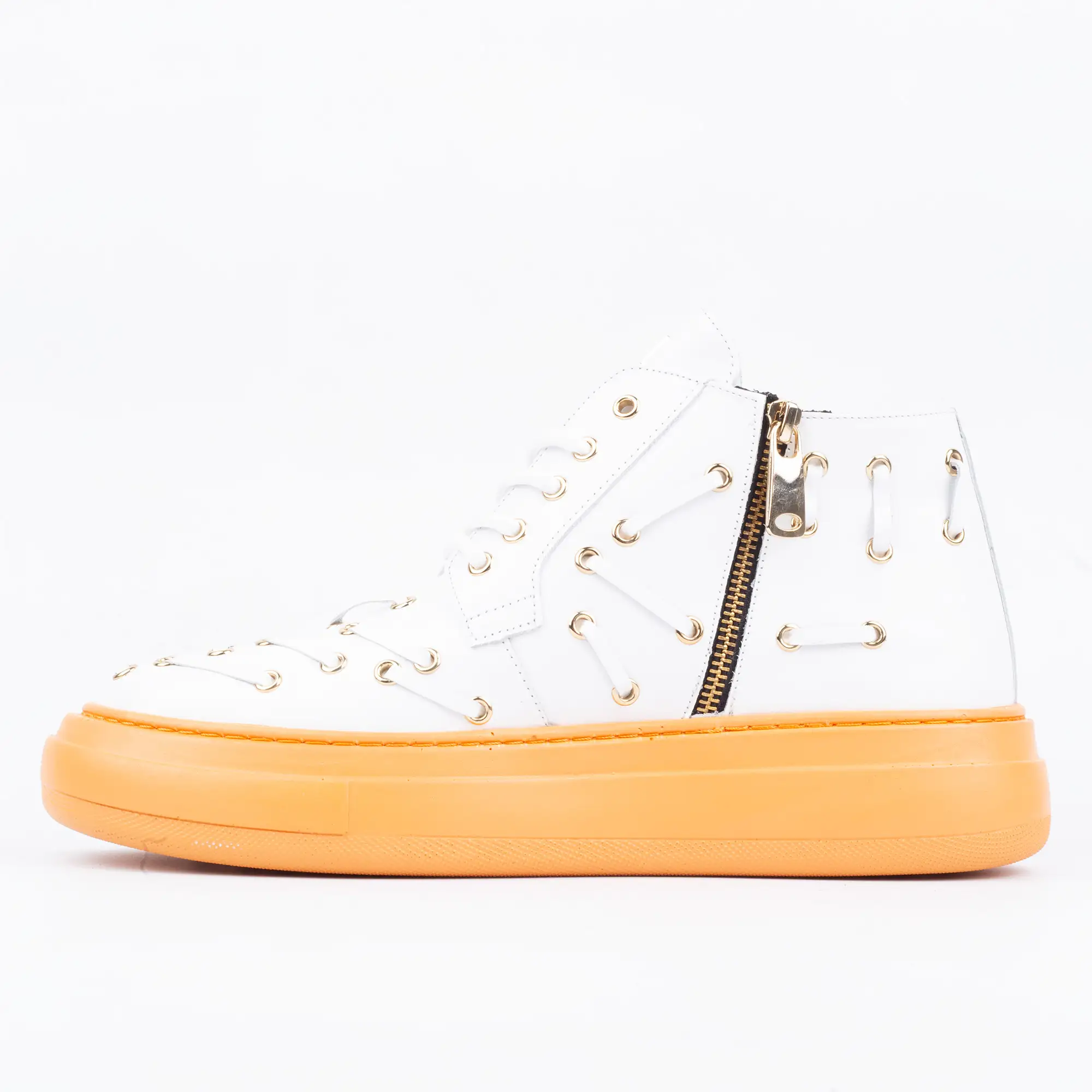 Every detail speaks of expert craftsmanship. The distinctive decorative eyelets, adorned with elegant golden rings, offer a unique visual texture that sets these sneakers apart from the ordinary. The bold, contrasting orange platform sole not only makes a striking fashion statement but also provides superior cushioning and support for all-day wear, transforming every step into a comfortable experience.