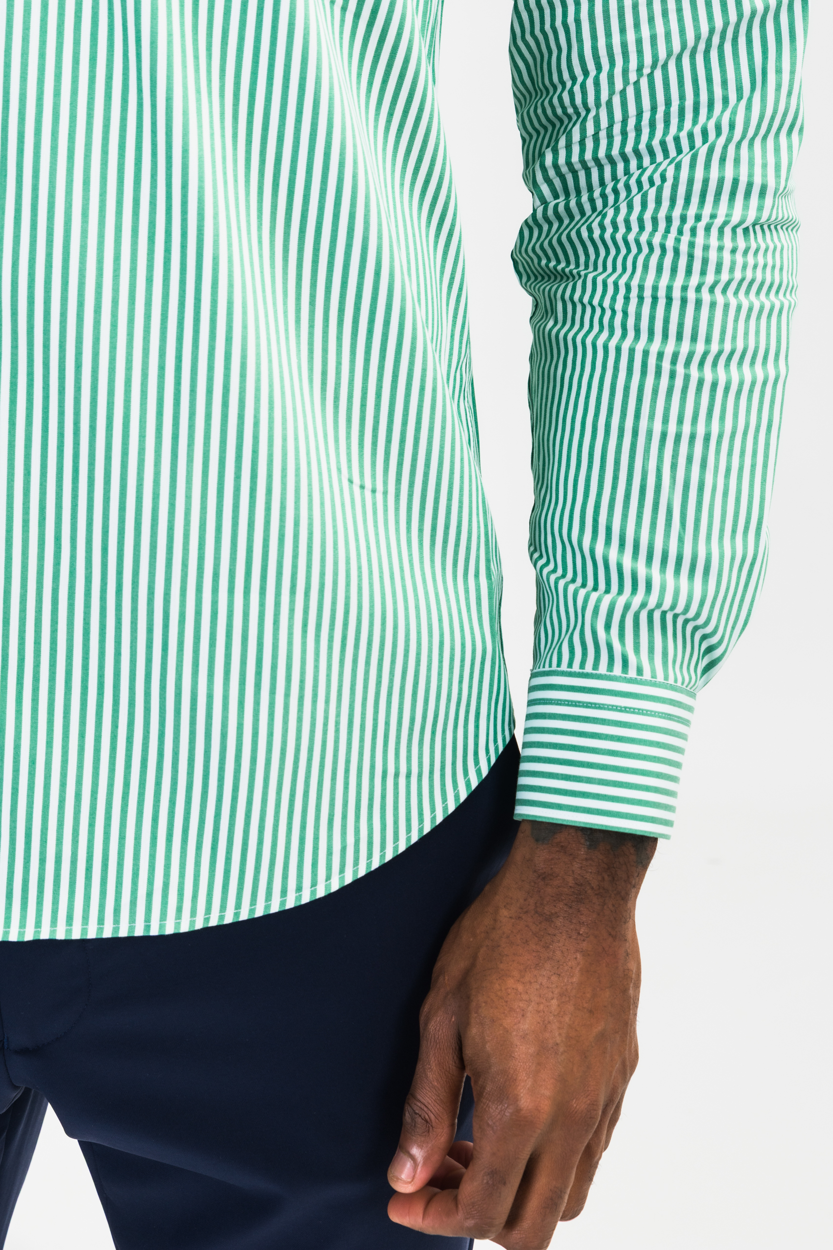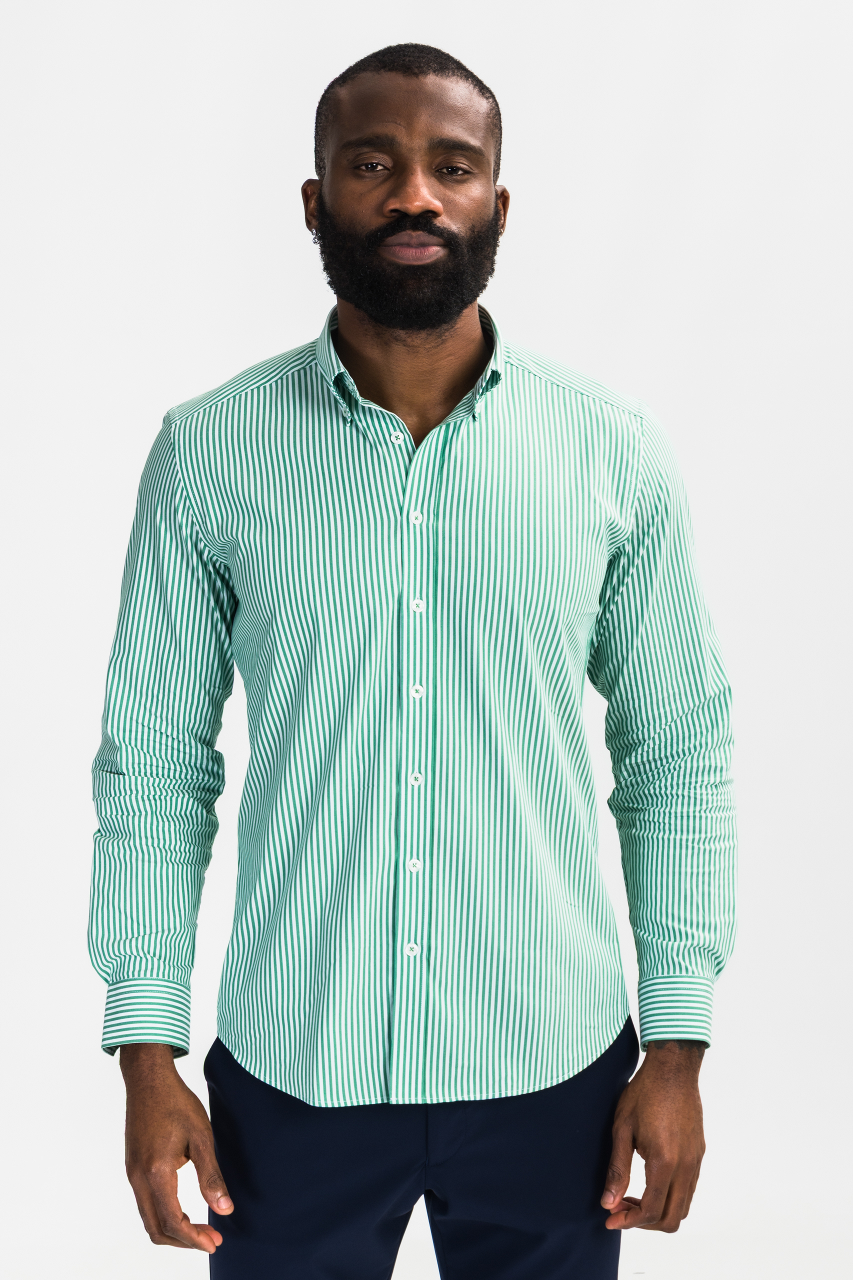 This green and white striped long-sleeved oxford shirt combines elegance, comfort, and practicality, making it a wardrobe essential for men who value style, quality, and versatility.
