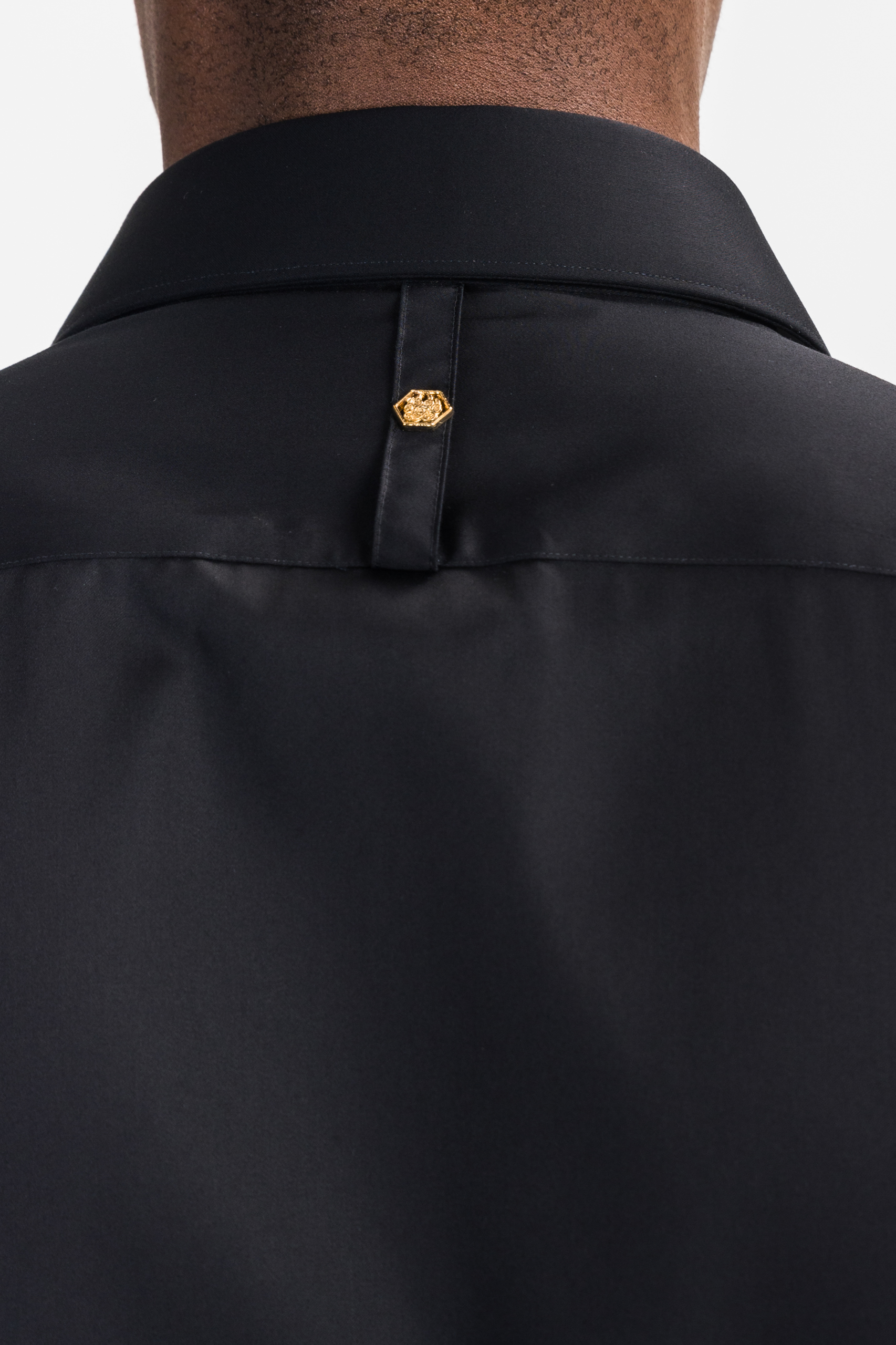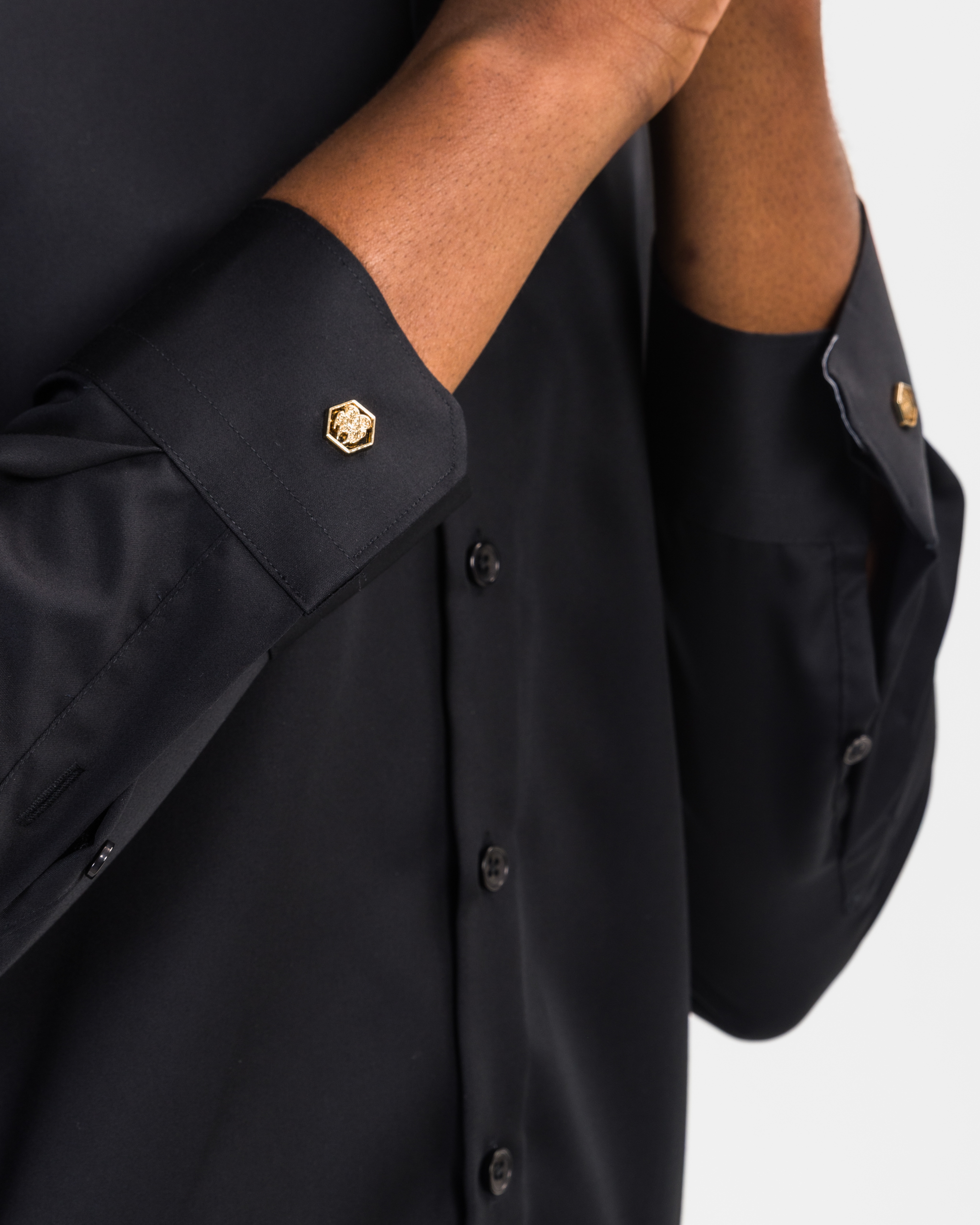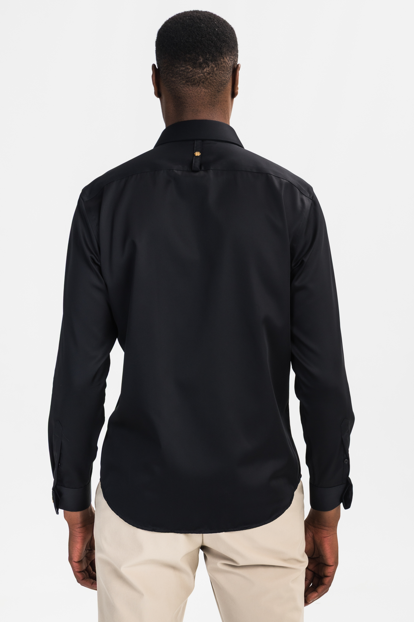 Precision stitching, premium buttons, and a clean-cut collar add to its sophisticated aesthetic. Whether paired with tailored trousers for office-ready sharpness or with denim for a sleek, elevated casual look, this black cotton non-iron shirt remains one of the most versatile pieces in any wardrobe. Its wrinkle-free technology also makes it a perfect travel companion, staying smooth even after packing.