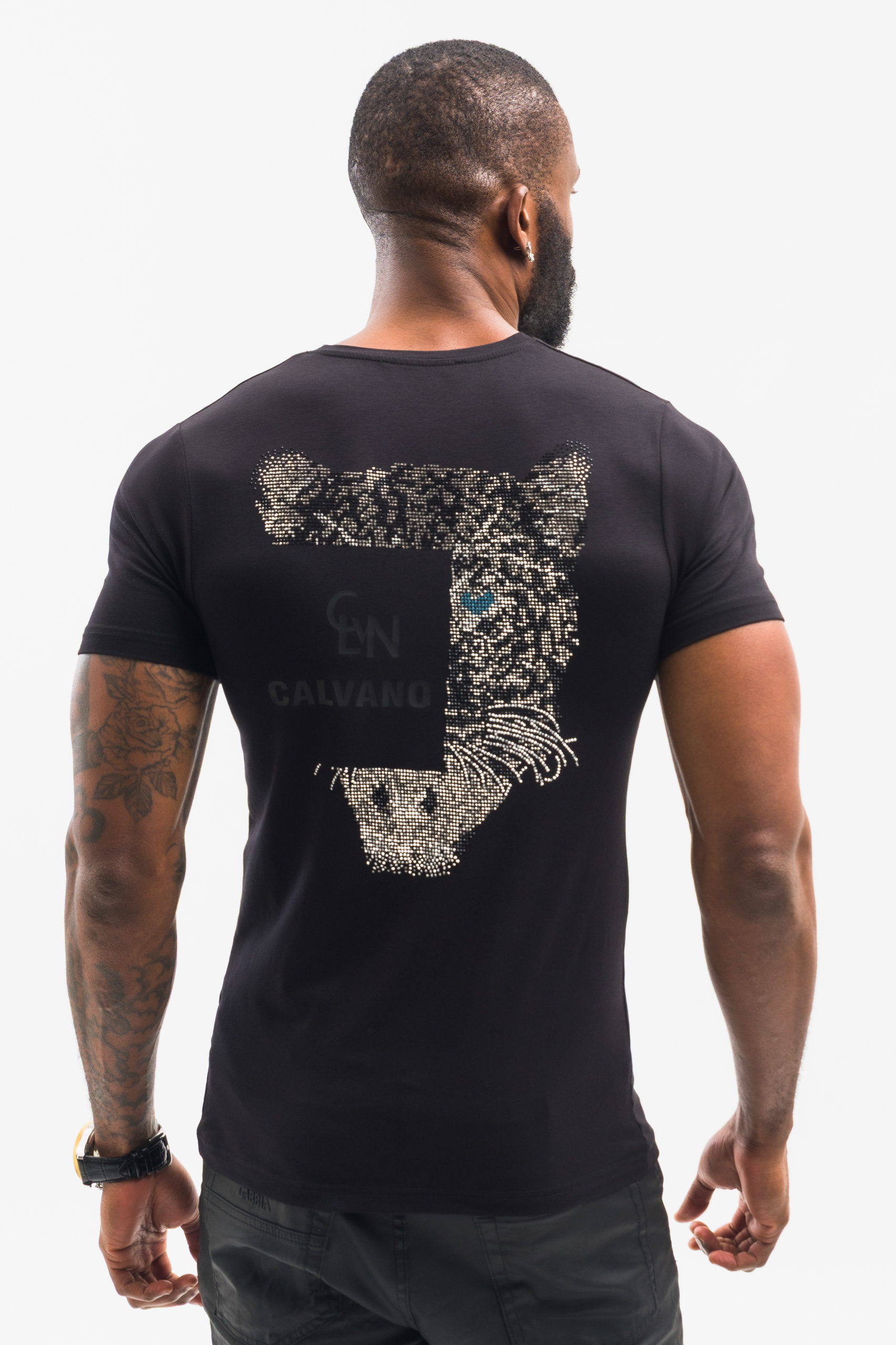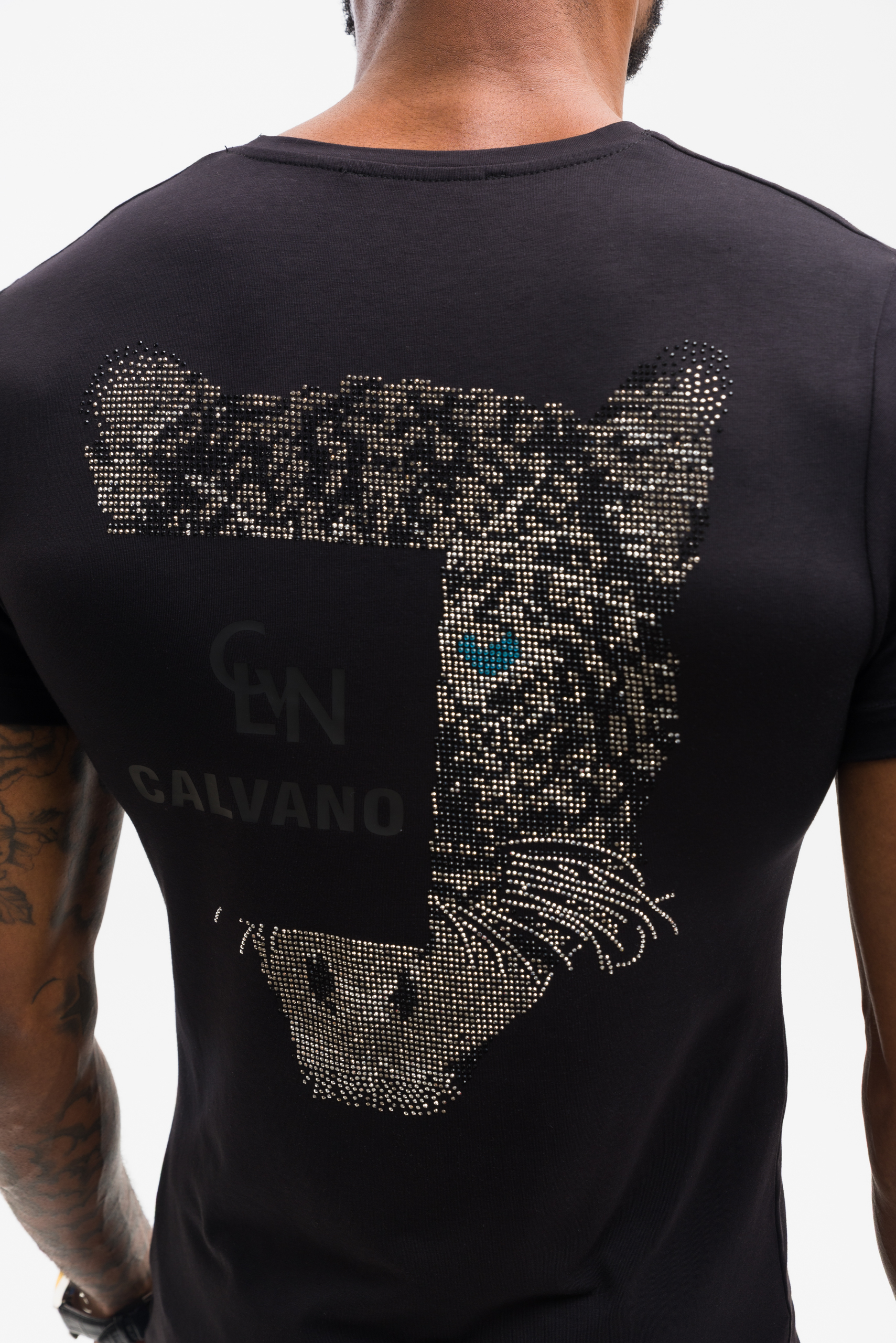 Focus Keyword: black Calvano rhinestone tiger back graphic t-shirt