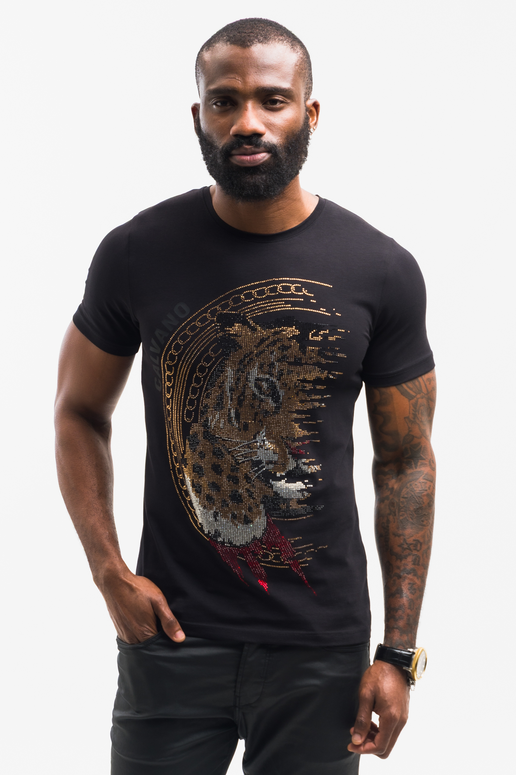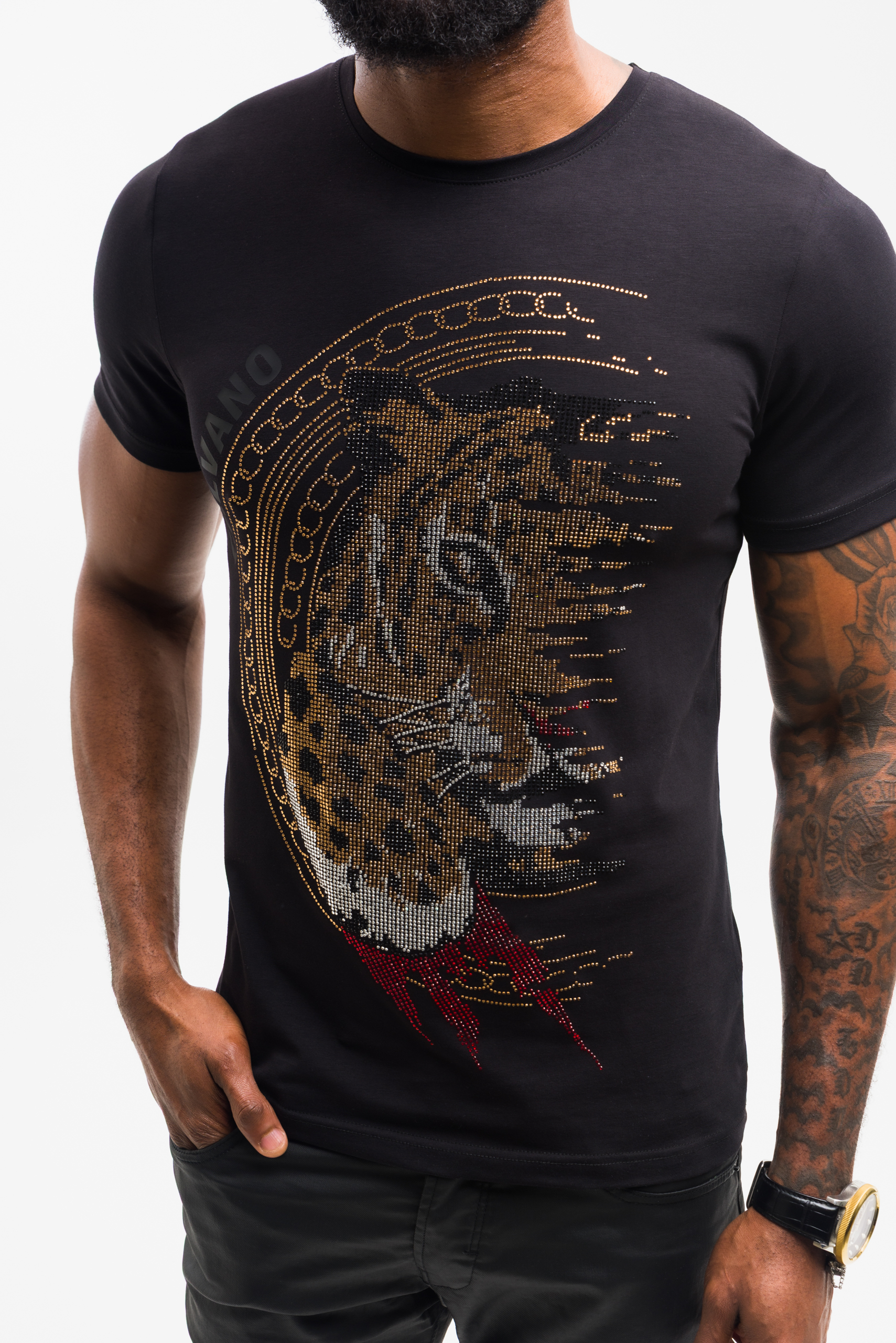 Whether paired with black jeans, tailored trousers, or a sleek jacket, this embellished leopard T-shirt instantly elevates any ensemble. It’s perfect for men who appreciate expressive fashion, premium craftsmanship, and standout wardrobe staples.