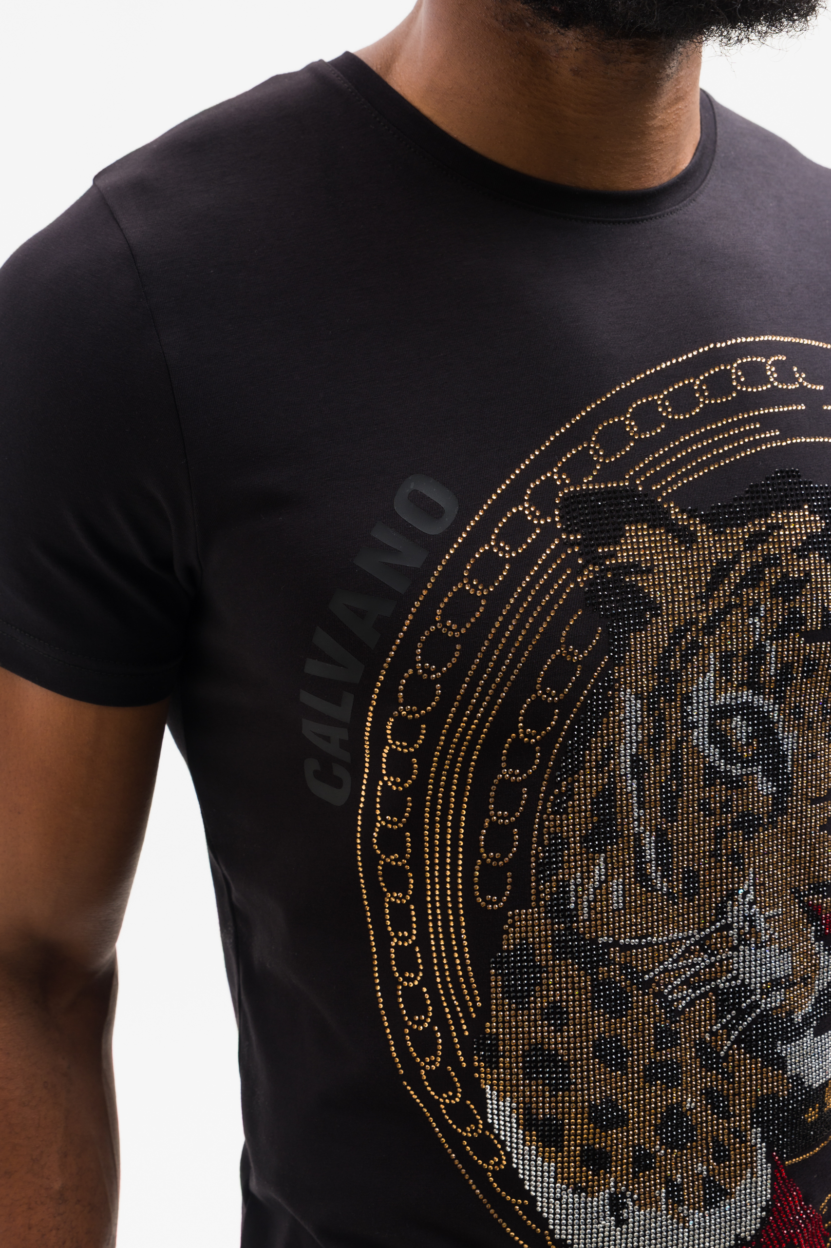 Focus Keyword: men’s black embellished leopard graphic t-shirt