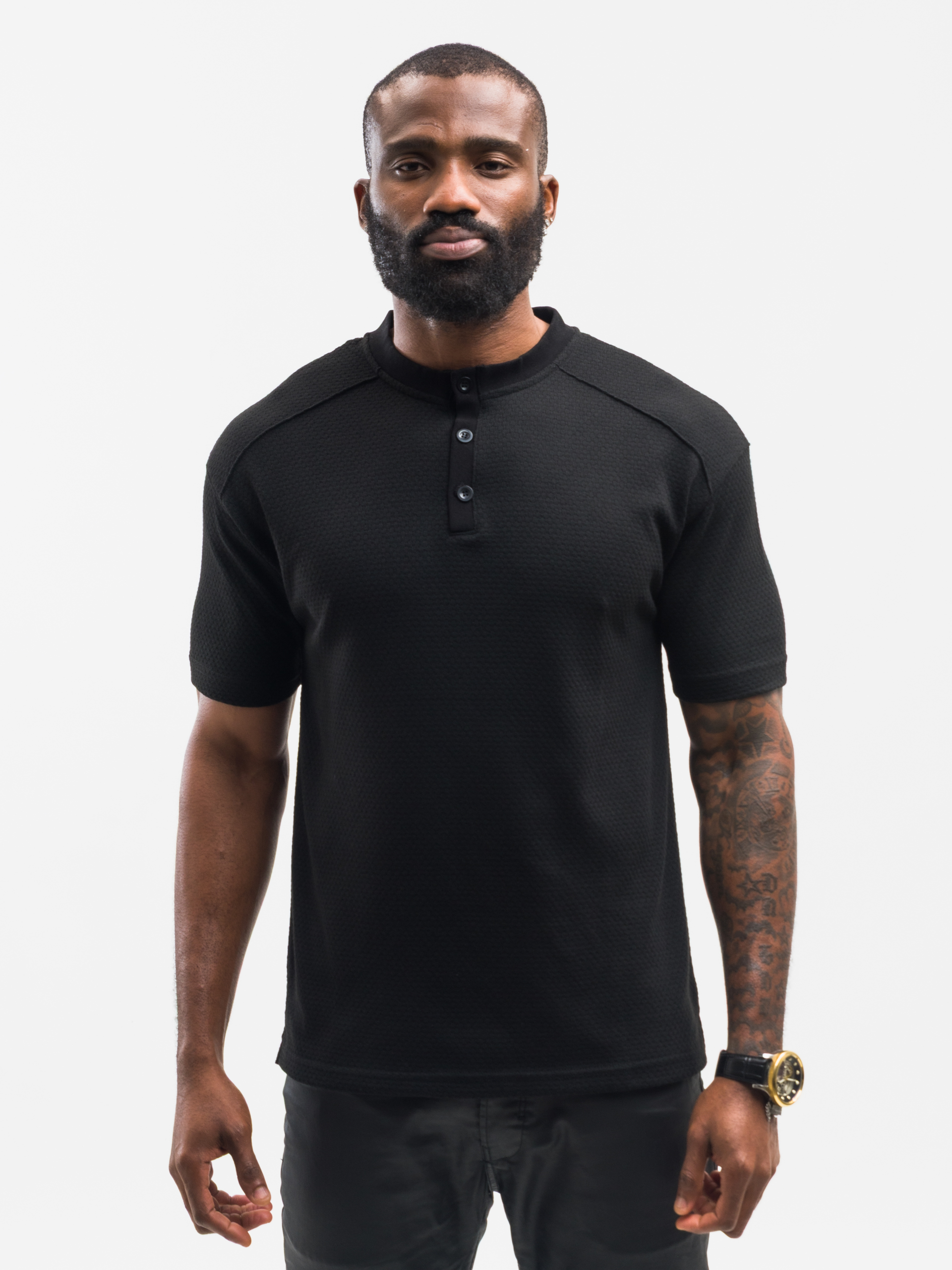 The classic Henley neckline, enhanced with a structured button-up placket, adds a polished touch that effortlessly transitions the shirt from casual to smart-casual settings. Its short sleeves ensure maximum comfort, while the tailored silhouette creates a flattering fit suitable for all body types. The rich black colour enhances its versatility, allowing it to pair seamlessly with jeans, chinos, shorts, joggers, or layered under jackets and overshirts for cooler days.