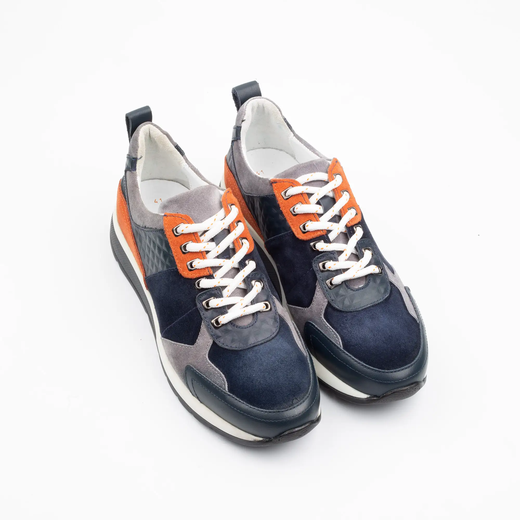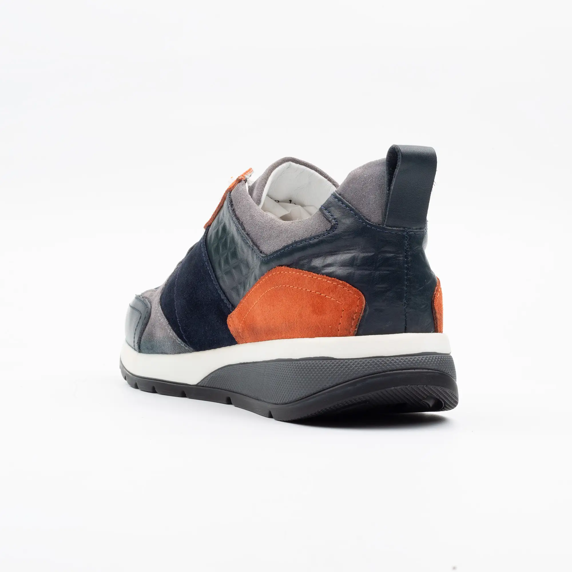 Crafted from a harmonious blend of supple full-grain leather and luxurious, soft-touch suede, the Apex sneaker offers a tactile experience like no other. Observe the deep navy and sophisticated grey suede panels, perfectly complemented by the vibrant burnt orange accents. Each stitch speaks to the artisanal expertise, showcasing intricate detailing and robust construction that guarantees lasting wear and timeless appeal.