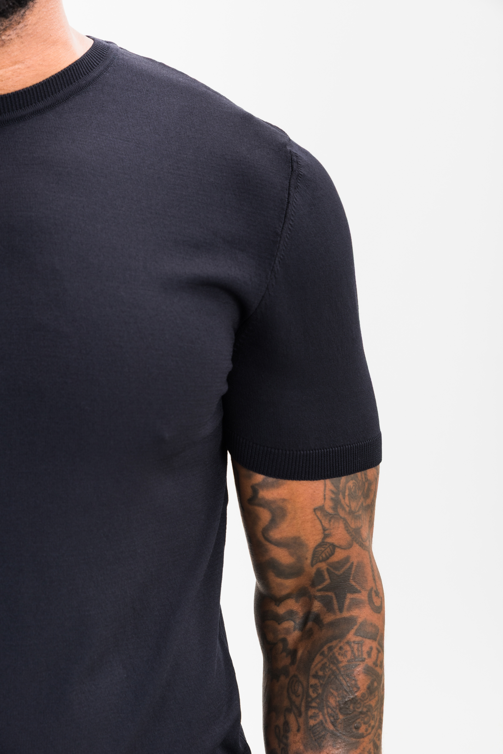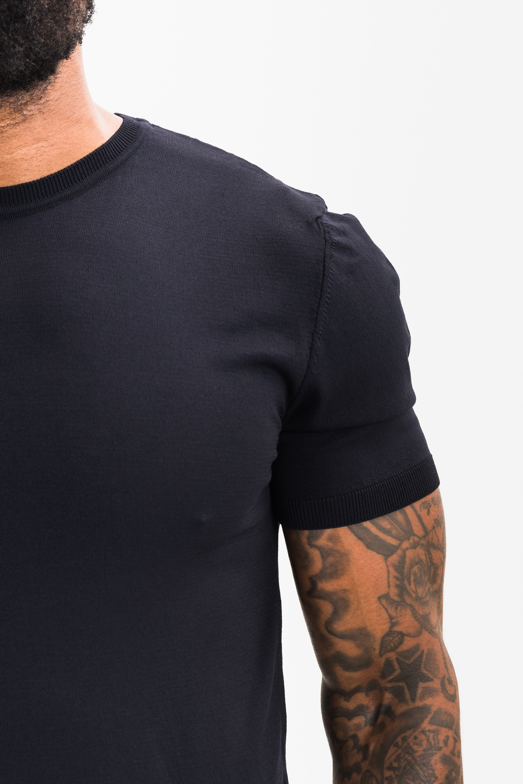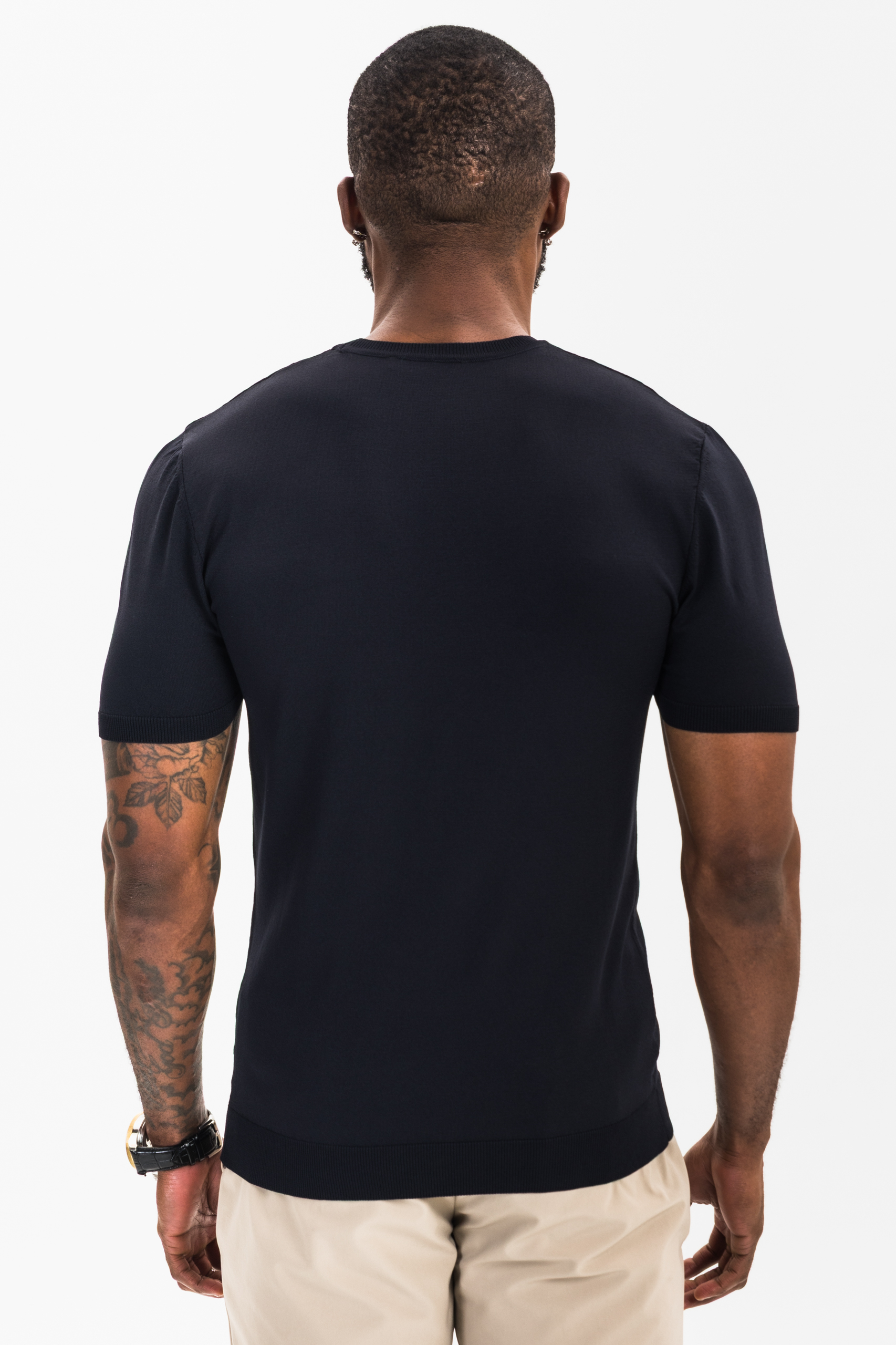 Featuring a clean round neckline, fitted sleeves, and a tailored silhouette, this knit T-shirt provides a flattering shape without compromising comfort. The ribbed hem and sleeve cuffs ensure a secure fit, adding subtle detailing that enhances its sophisticated aesthetic. Its soft off black colour introduces versatility and elegance, making it easy to pair with chinos, tailored trousers, jeans, or even layered under a blazer for a smart-casual outfit.