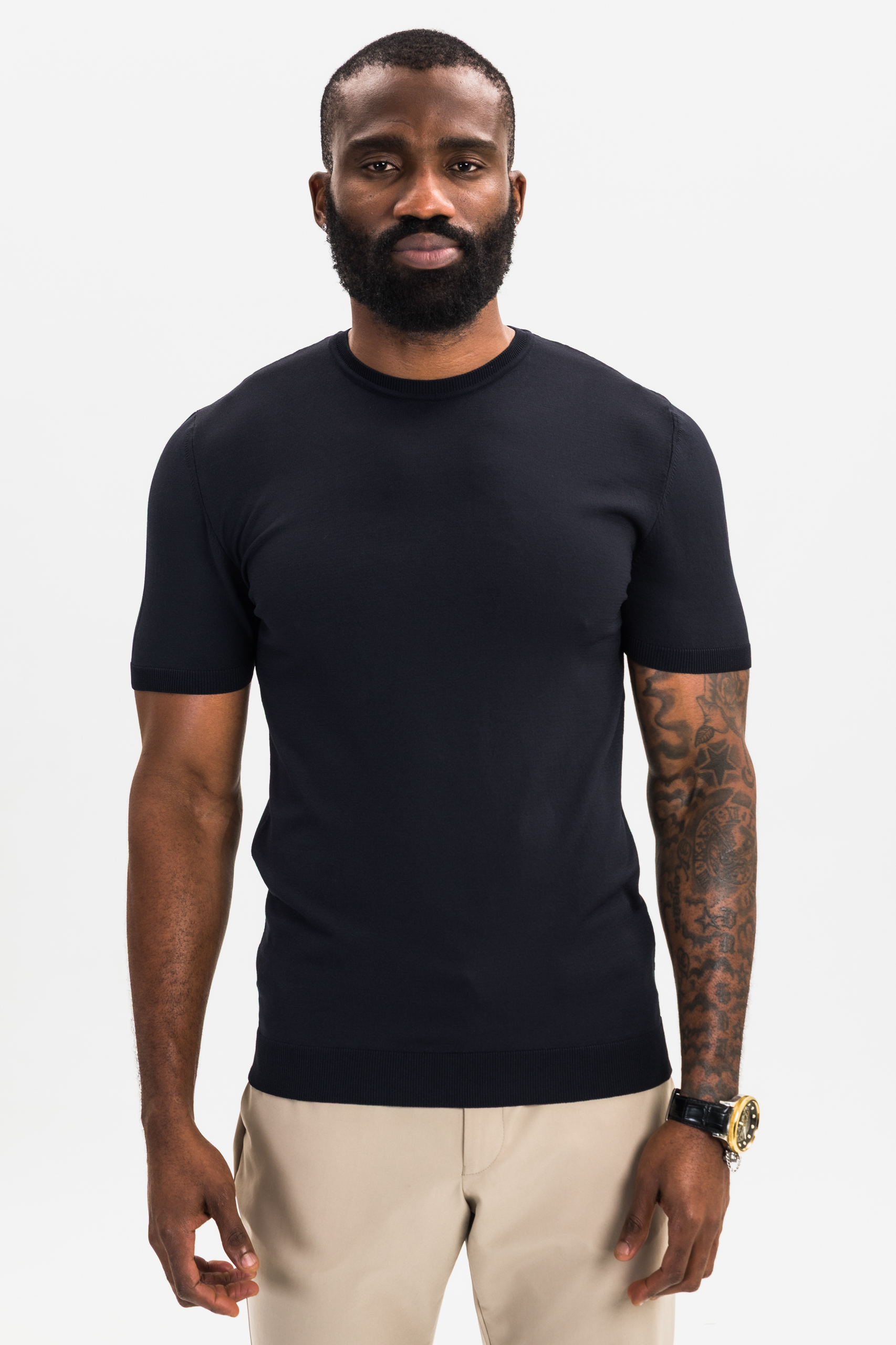 Perfect for warm weather, office-casual styling, evening outings, or weekend wear, this premium knit T-shirt transitions seamlessly across seasons and occasions. Whether worn as a statement standalone piece or as part of a layered look, it provides understated luxury with every wear. Designed for men who appreciate quality, minimalism, and elevated basics, this off black knit short sleeve T-shirt is a timeless addition to any curated wardrobe.