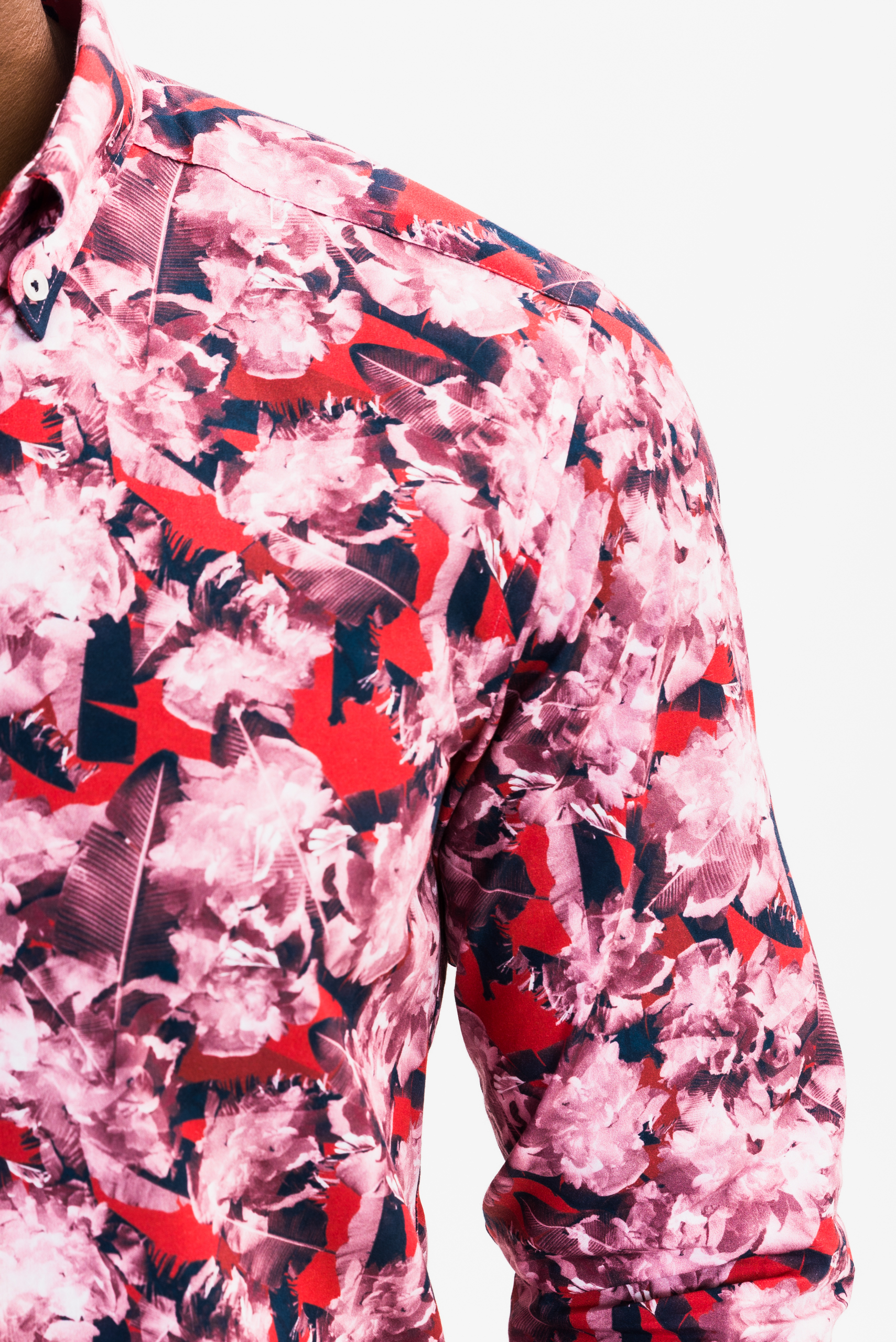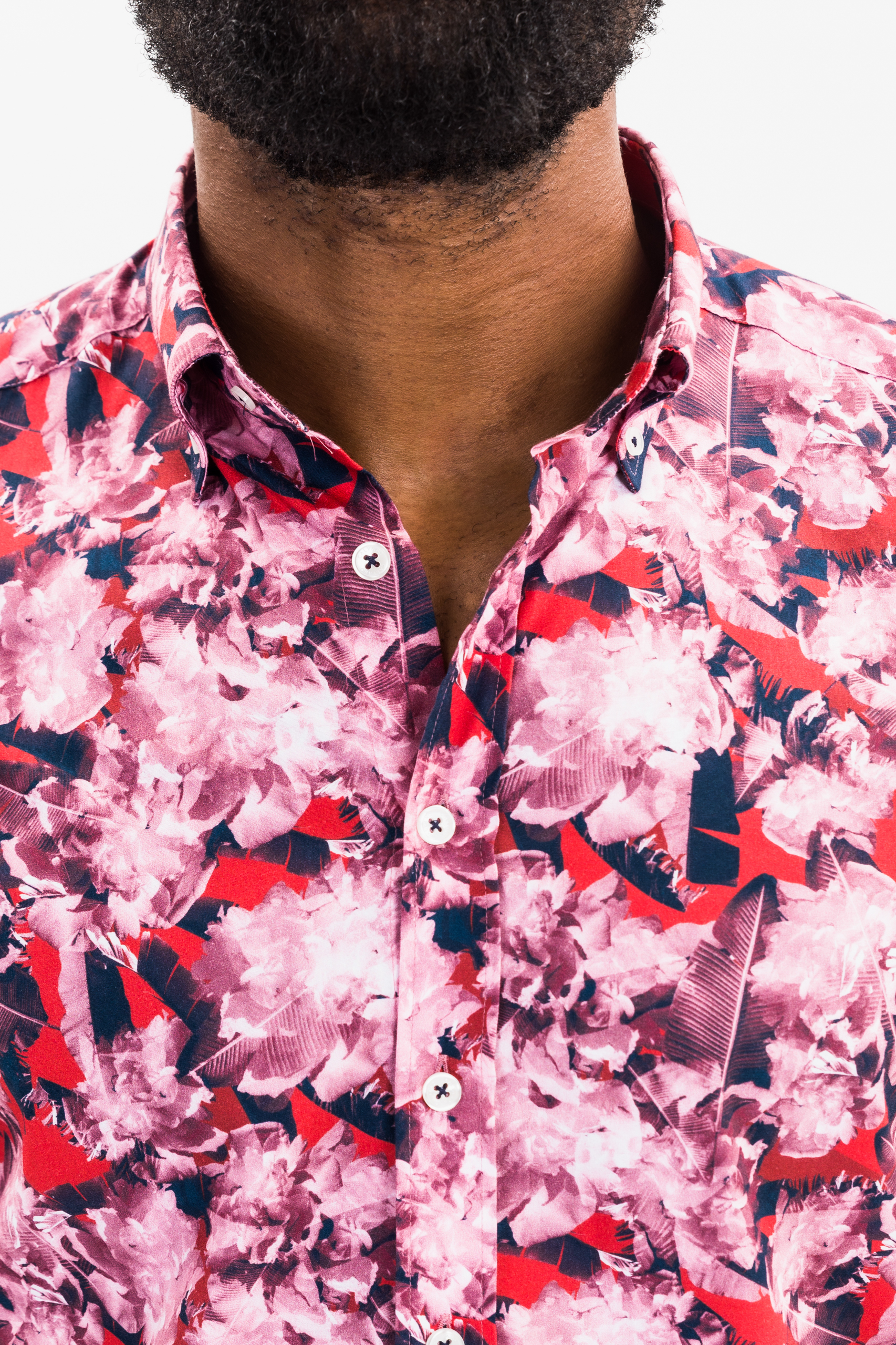 Focus Keyword: men’s red pink navy floral abstract print shirt