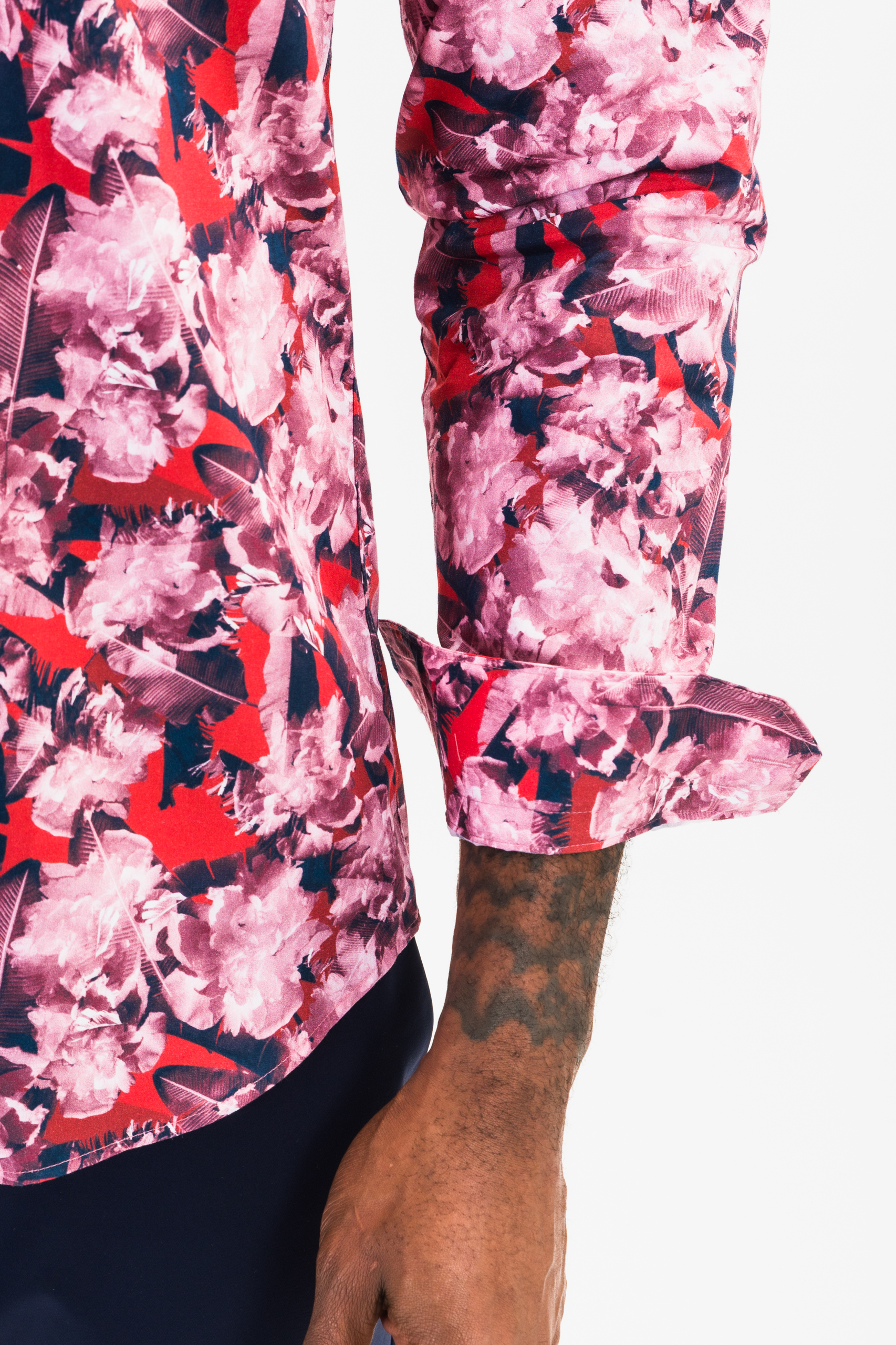 This men’s slim-fit, long-sleeve button-down shirt is defined by a striking floral and abstract print rendered in dynamic shades of red, pink, and navy blue. Designed for individuals who appreciate expressive style and contemporary sophistication, this shirt blends artistic patterning with a sharply tailored silhouette. The interplay of vivid color tones creates visual movement, while the abstract floral motifs add depth and character, delivering a distinctive look that transitions seamlessly from casual refinement to elevated evening wear.