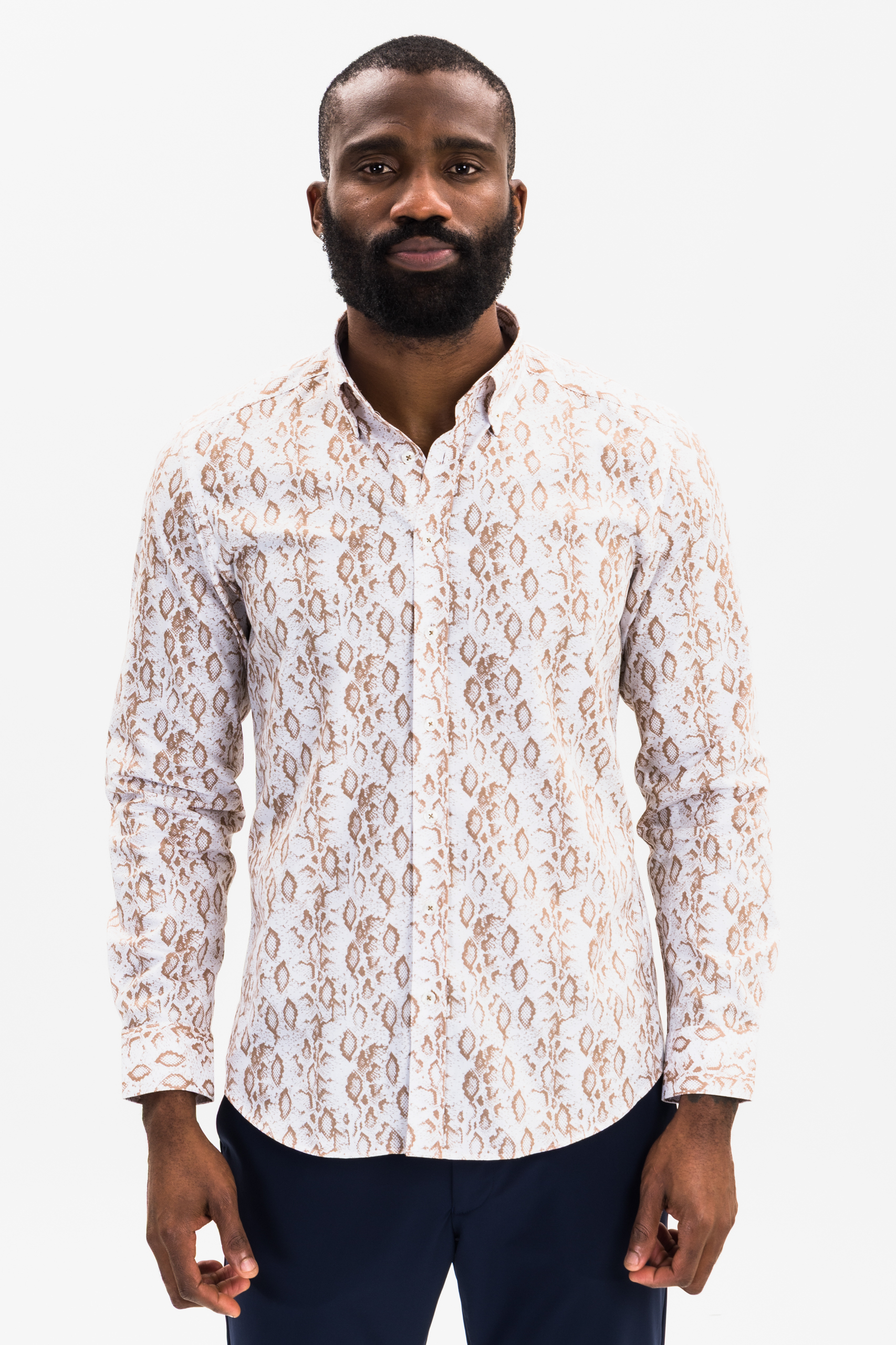 This beige and white snakeskin patterned shirt is an excellent choice for trend-driven dressers who want versatility without sacrificing style. It seamlessly transitions across seasons, making it ideal for fashion-forward wardrobes that value distinctiveness and quality. Whether worn as a statement piece or paired with understated accessories, the shirt adds a unique touch that remains sophisticated and timeless.