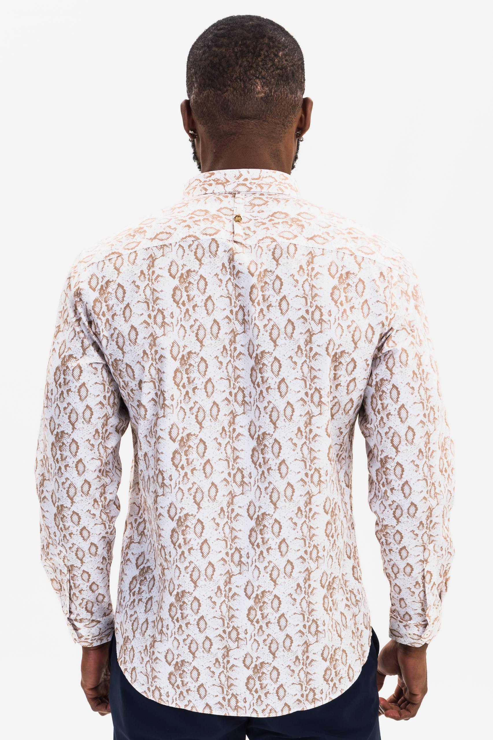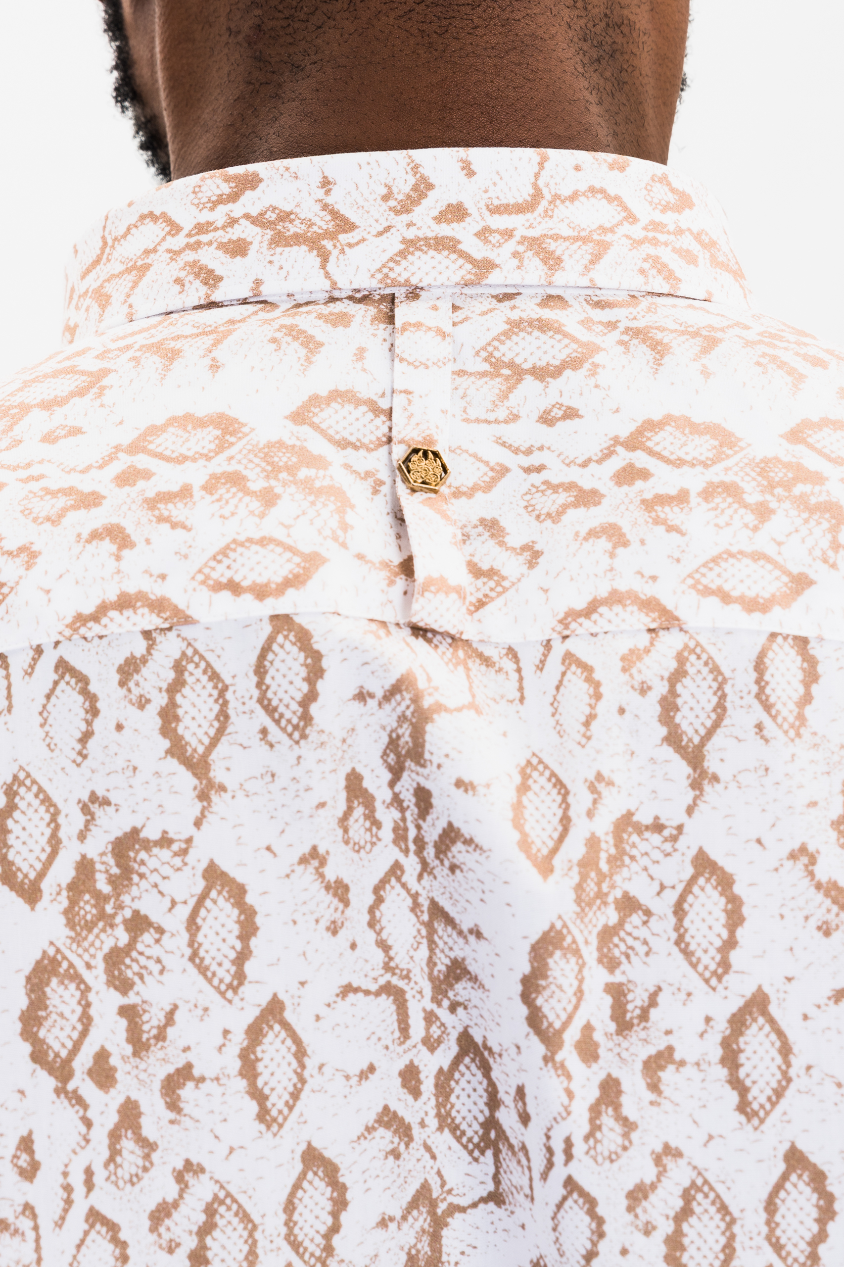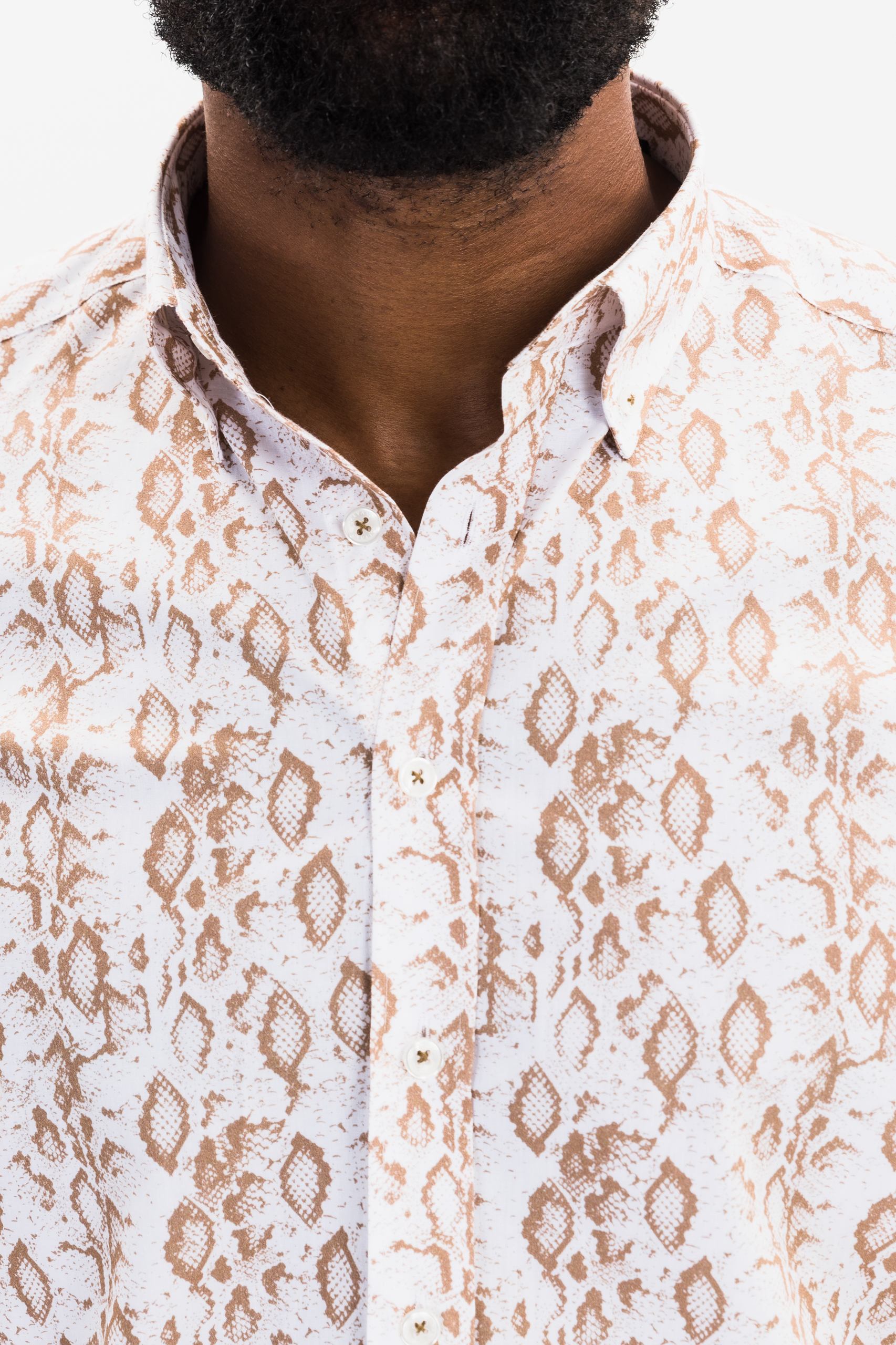 white and beige reptile print button-down