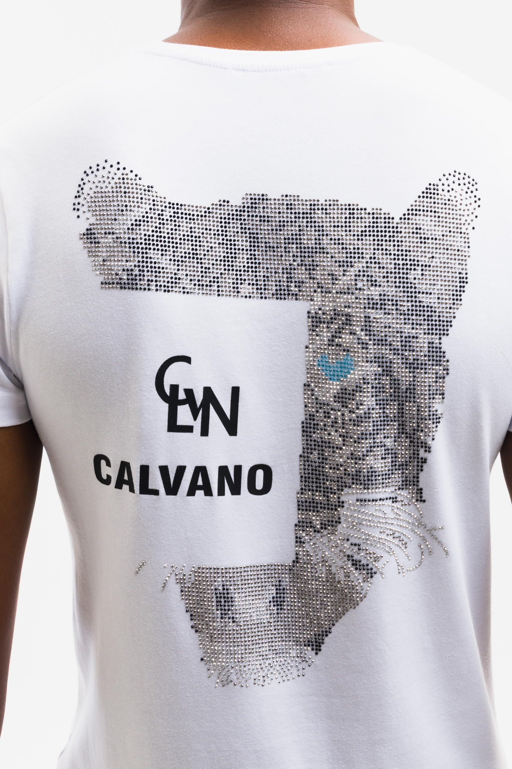 Focus Keyword: white Calvano rhinestone tiger back graphic t-shirt