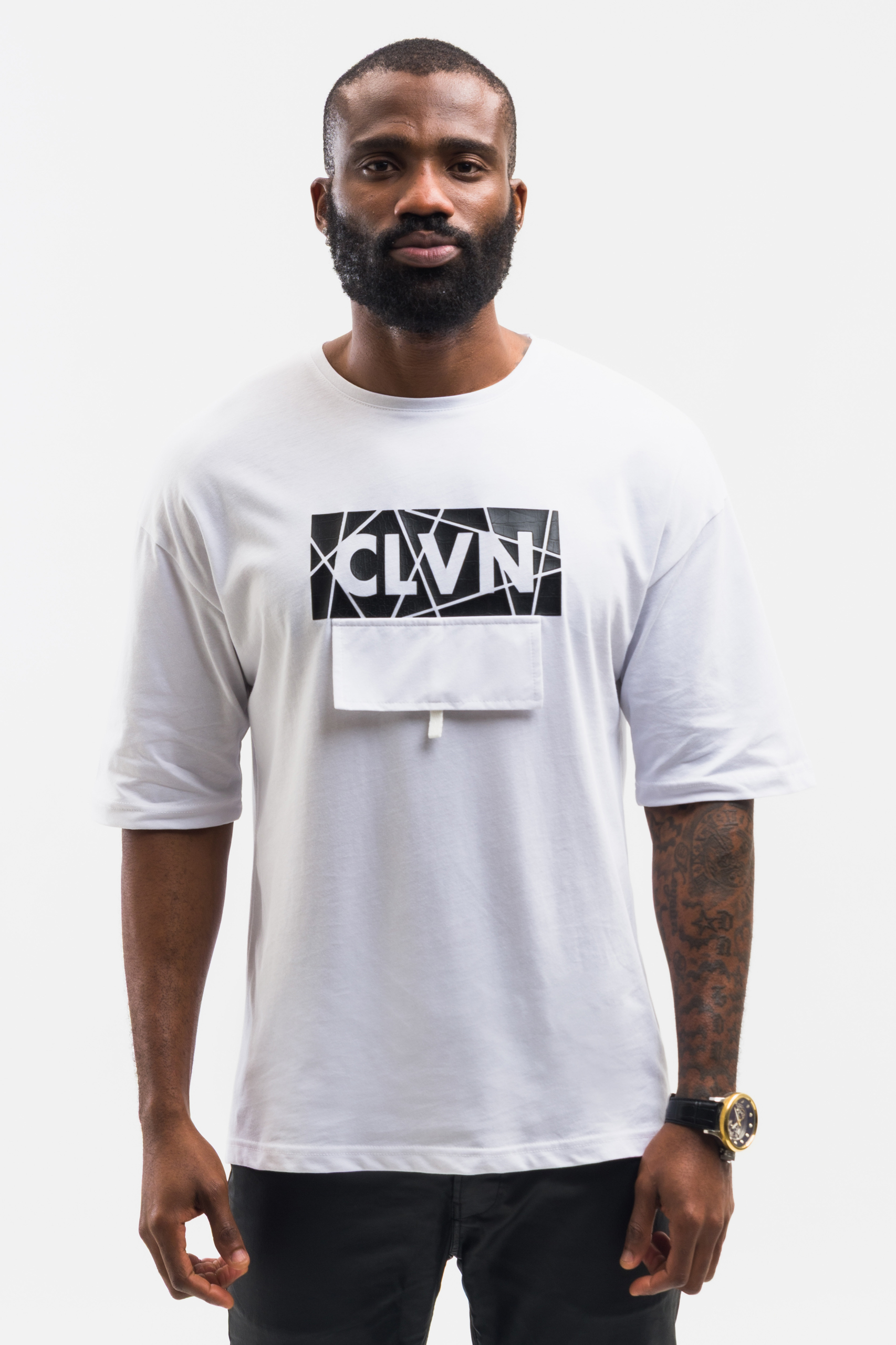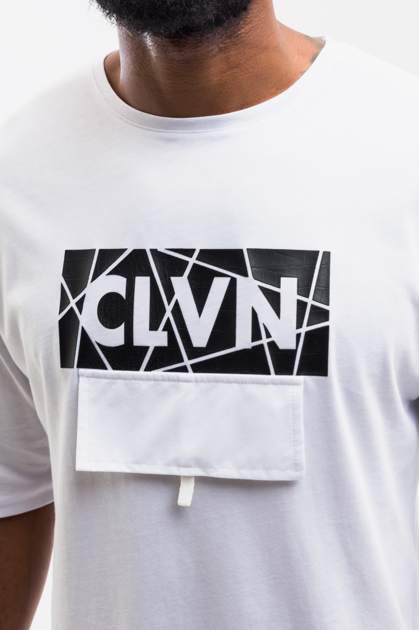 This Men’s White Designer Pocket Patch T-Shirt from Calvano delivers a clean, modern streetwear aesthetic tailored for men who value simplicity elevated through detail. Designed with a crisp white base, the tee features a bold black geometric chest panel that incorporates the signature CLVN branding, creating a visually striking contrast that stands out while maintaining a minimalist approach. The structured front pocket patch adds a unique dimensional element, merging utility with high-end fashion cues for a refined yet urban finish.