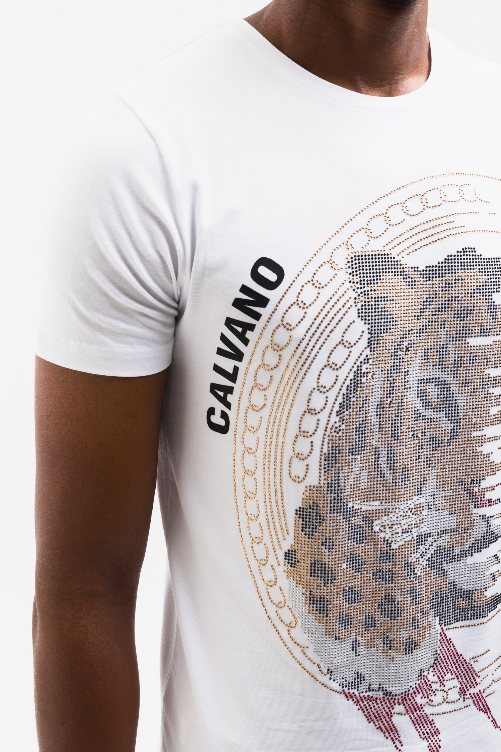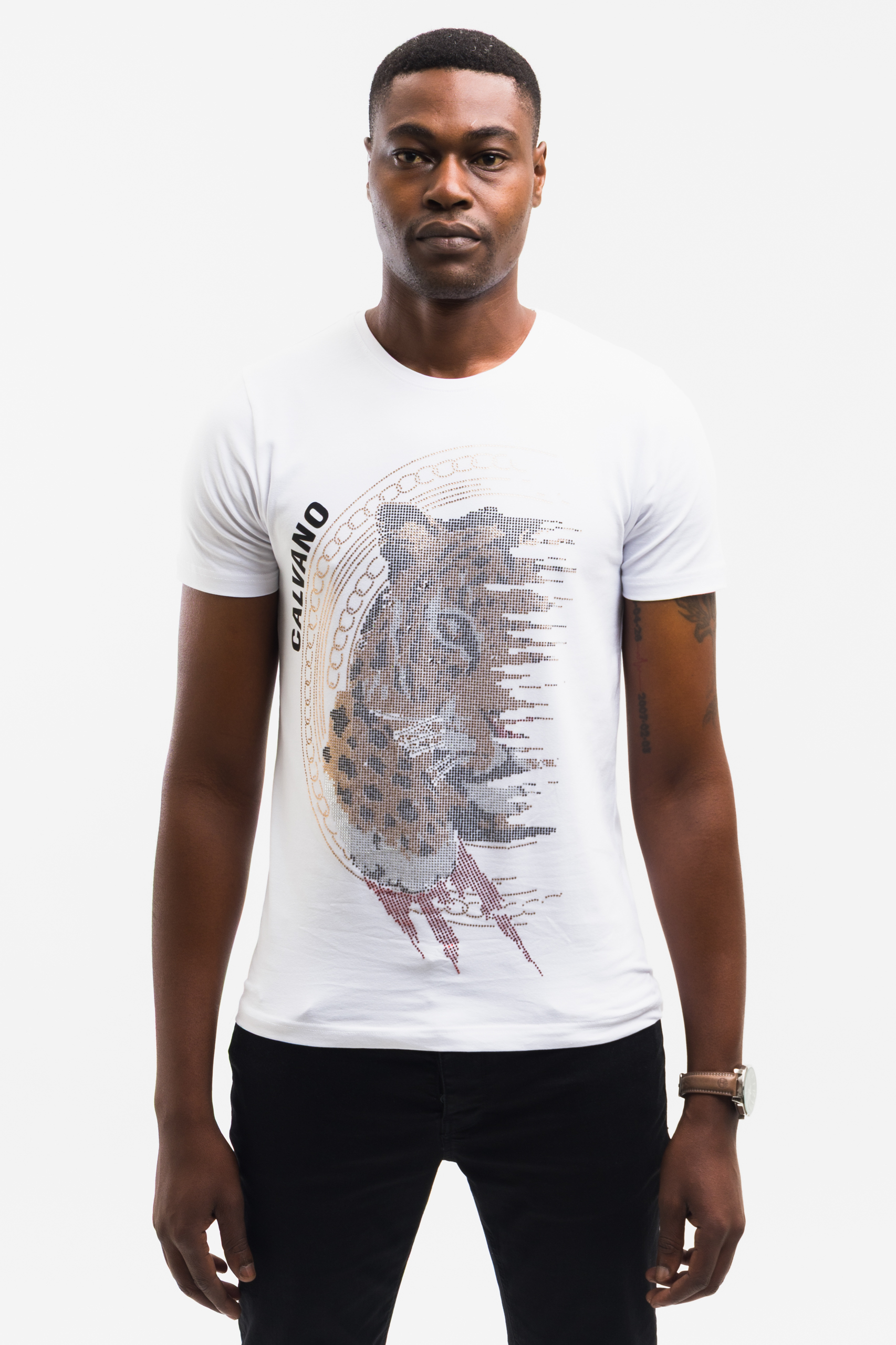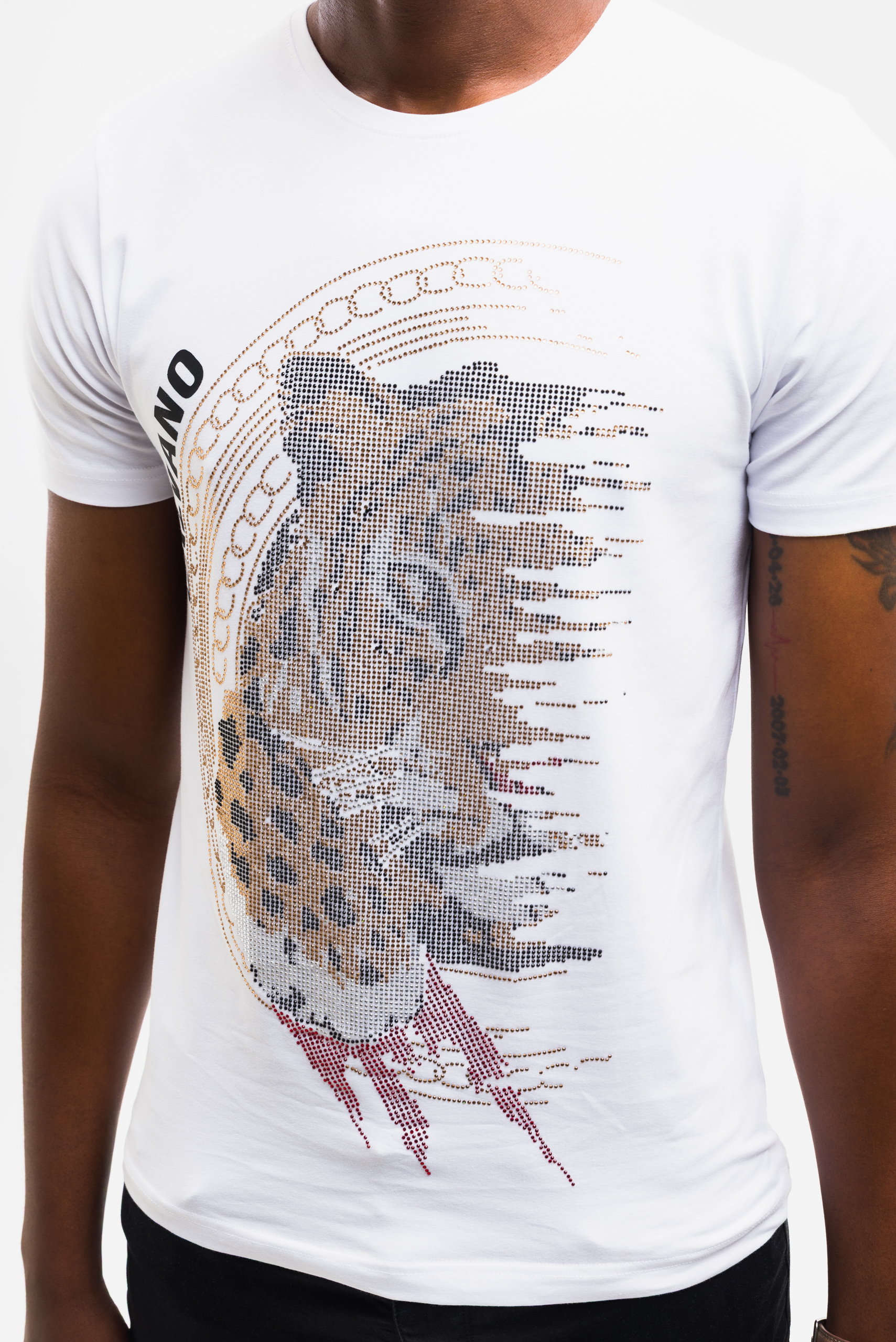 Focus Keyword: men’s white embellished leopard graphic t-shirt