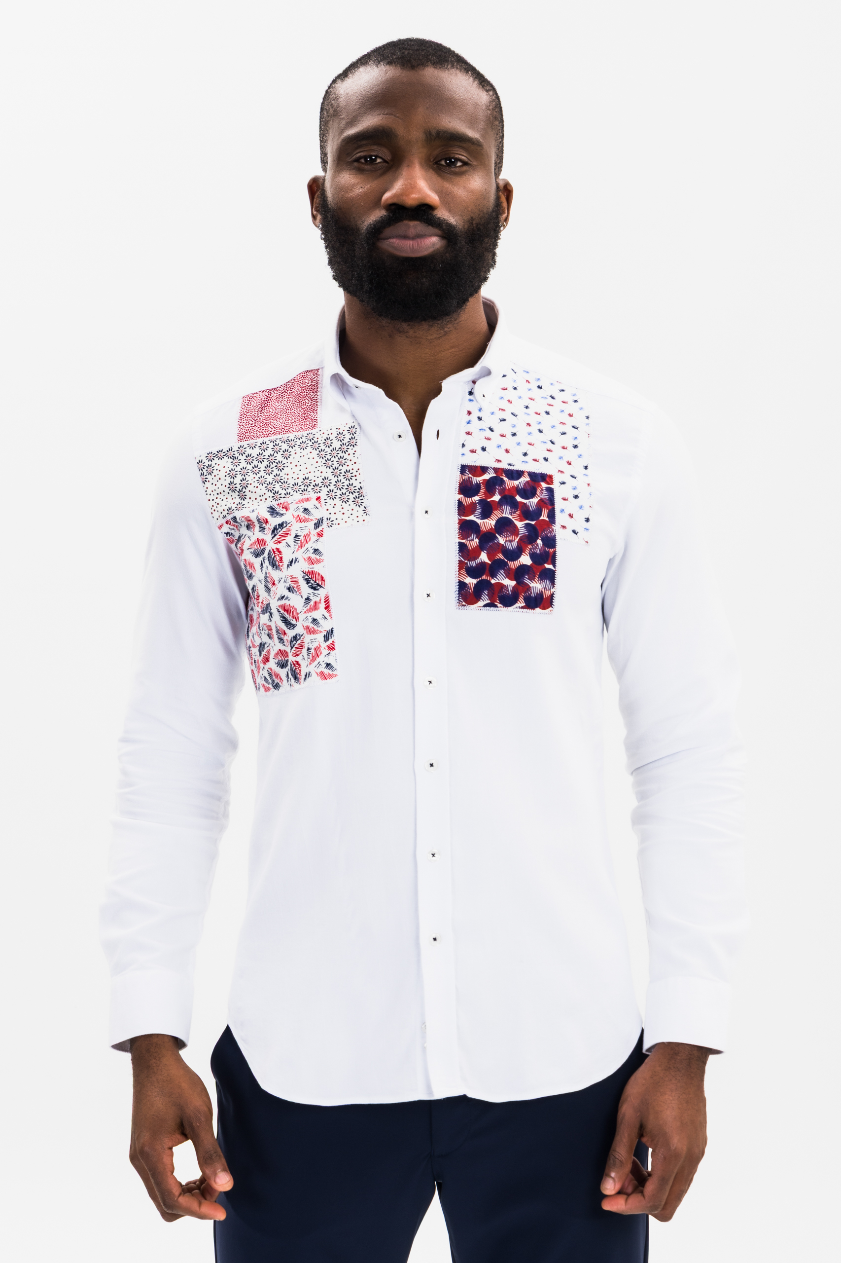 The shirt’s minimalist construction, paired with its bold patchwork detailing, delivers a balanced design that speaks to confident dressers seeking clothing that sets them apart. When paired with navy trousers, dark denim, or slim chinos, it creates a polished and memorable look that reflects modern elegance. The multicolor prints add vibrancy while the crisp white foundation maintains a clean, premium aesthetic.