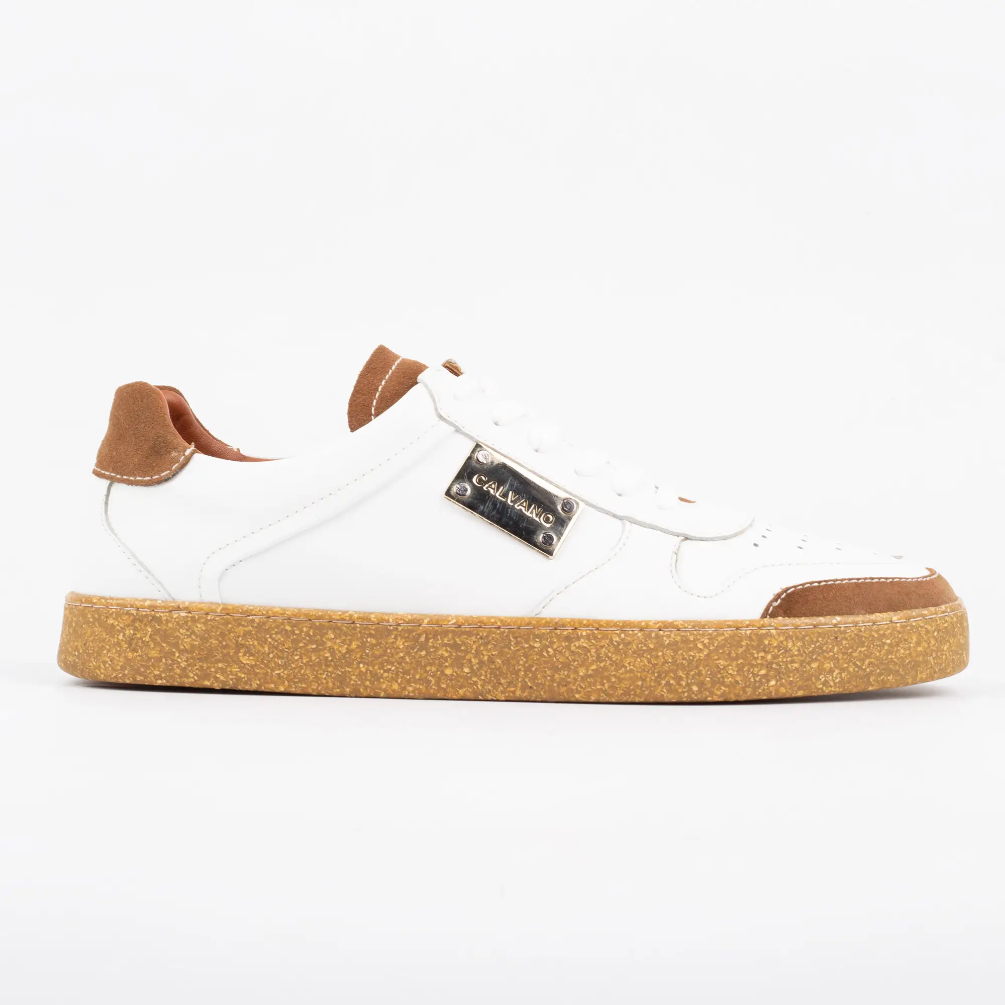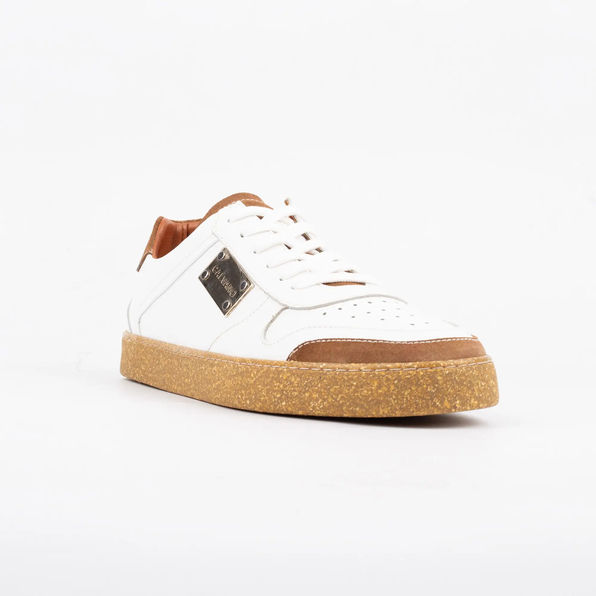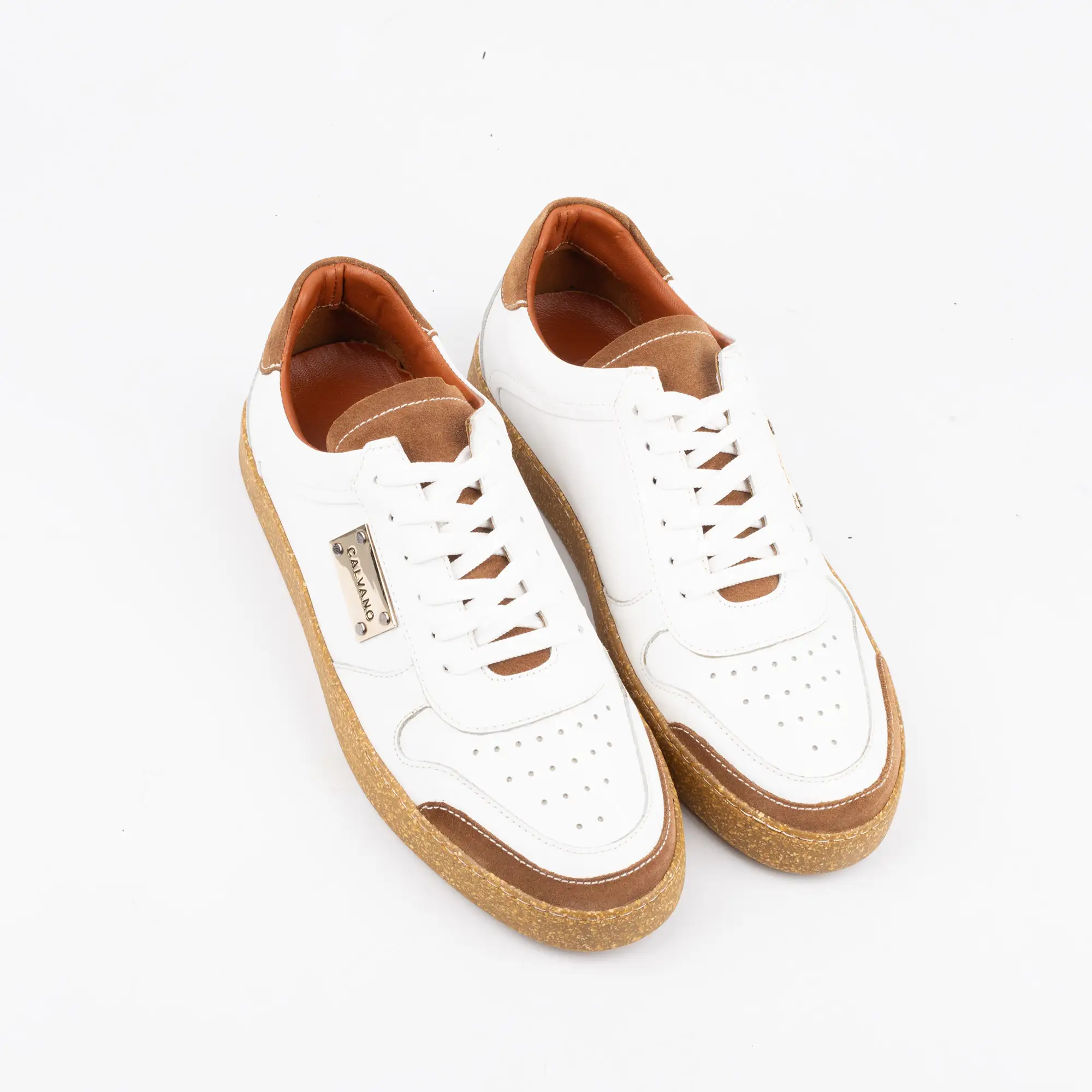 The moment you lace up the Calvano White & Tan Leather Casual, a palpable sense of ease settles over you. Your fingers glide across the smooth, rich full-grain leather upper, noticing the subtle perforations that hint at breathable comfort. Feel the crisp white laces tighten securely, a perfect contrast to the distinct tan accents and the remarkable, granulated texture of the cork-inspired sole beneath your palm. This isn’t just a shoe; it’s an immediate embrace of luxury and comfort, tailored for the man who demands both without compromise.