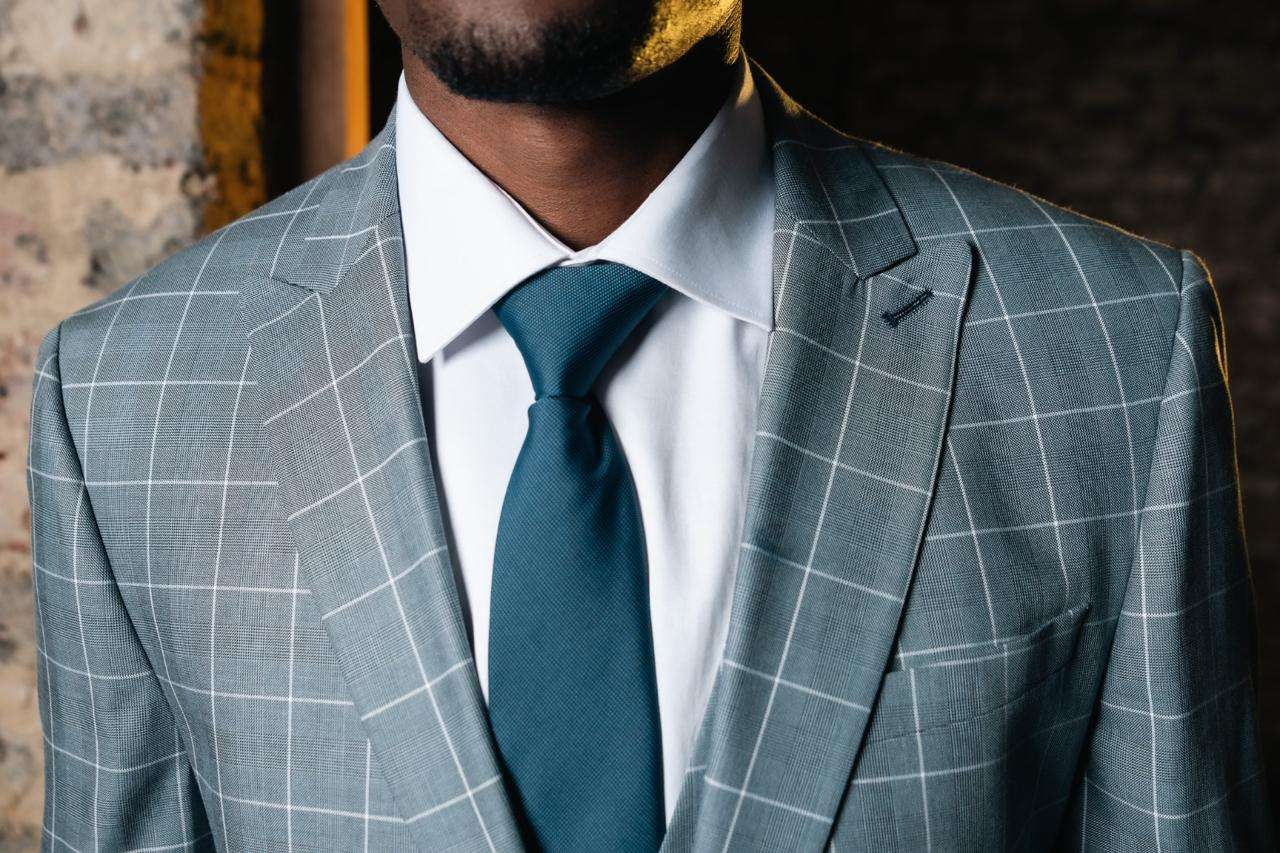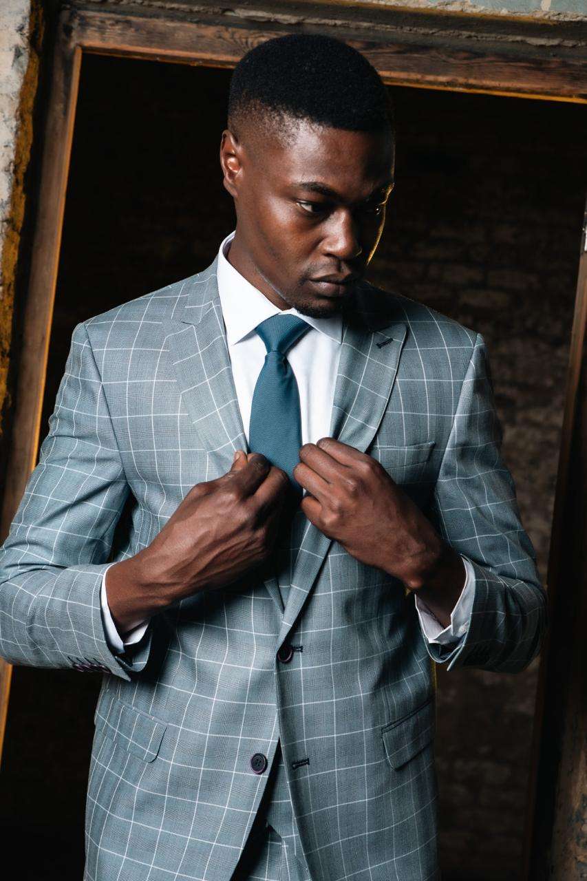 Made from premium-quality fabric, the suit’s windowpane check pattern offers a subtle yet eye-catching detail. The lines add a geometric appeal that complements the sharp tailoring of the suit, making it a great option for men who want to stand out without going overboard. The neutral tones of the fabric make it versatile, allowing you to pair it with a wide range of shirt and tie combinations, such as the classic white shirt and a contrasting blue tie, as seen in this ensemble.