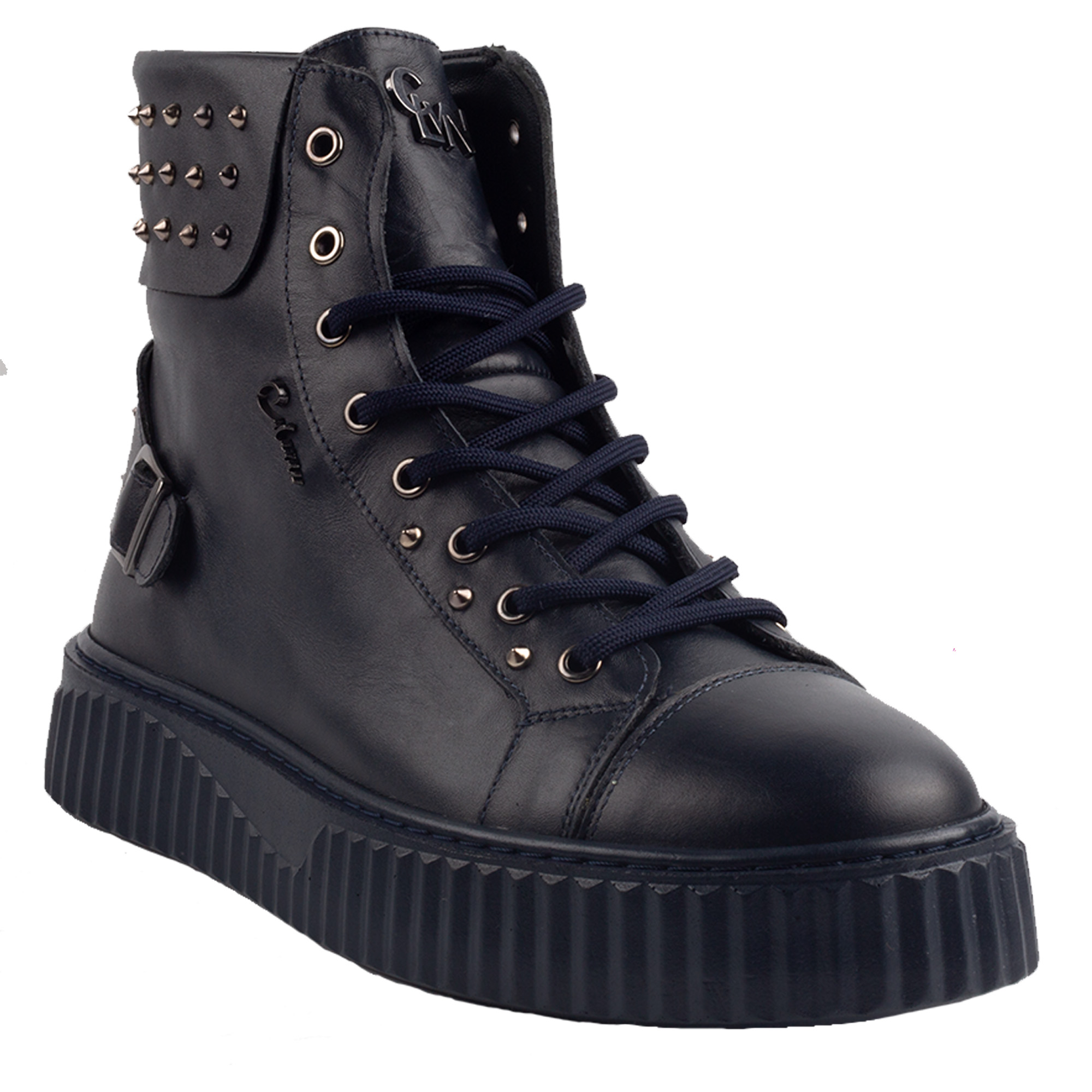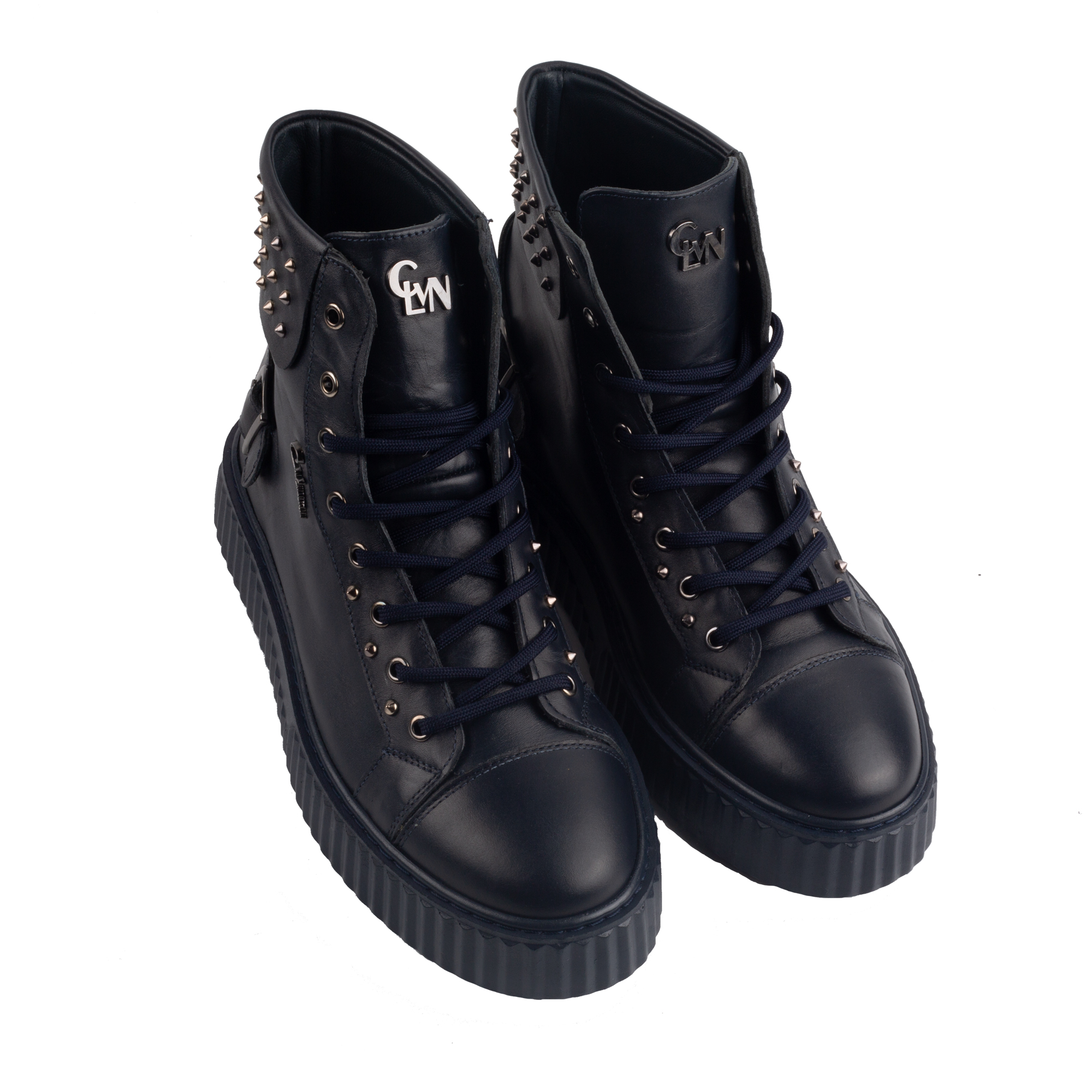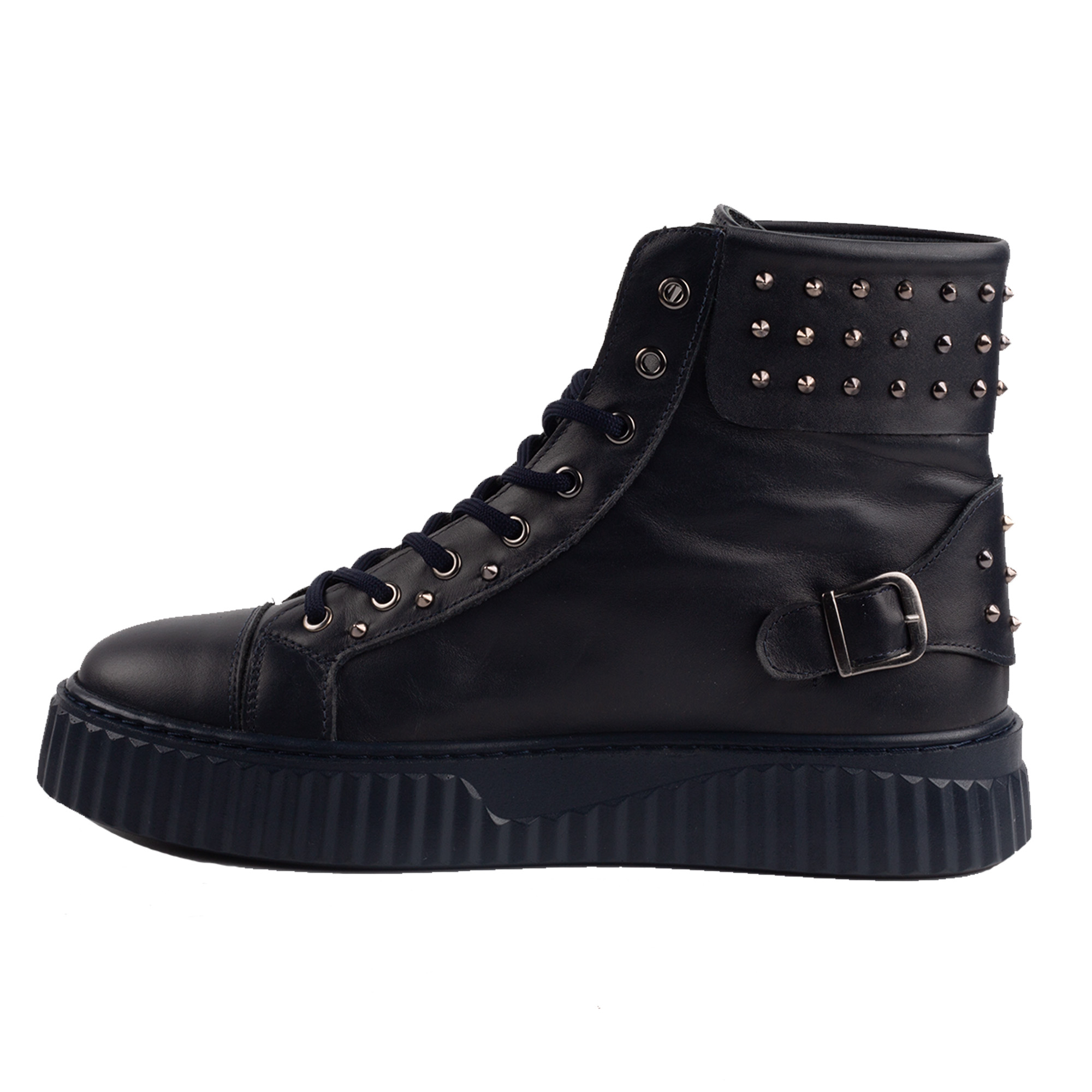 What sets these sneakers apart is the striking stud detailing on the heel collar, offering a rockstar aesthetic without compromising comfort or wearability. The high-top silhouette provides ankle support and an urban edge, while the thick ridged sole ensures grip and durability on all surfaces. The tonal navy laces, metal eyelets, and side zipper enhance the style and functionality—making these shoes as practical as they are stylish.