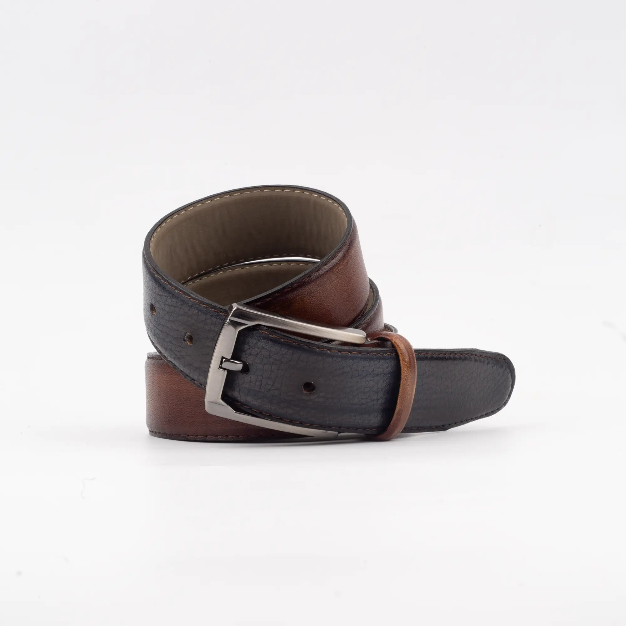 The Calvano Navy & Light Brown Leather Belt represents a pinnacle of dual-textured artistry. This accessory harmonizes the depth of midnight blue with the warmth of sienna, creating a visual dialogue suitable for the most refined South African ensembles.