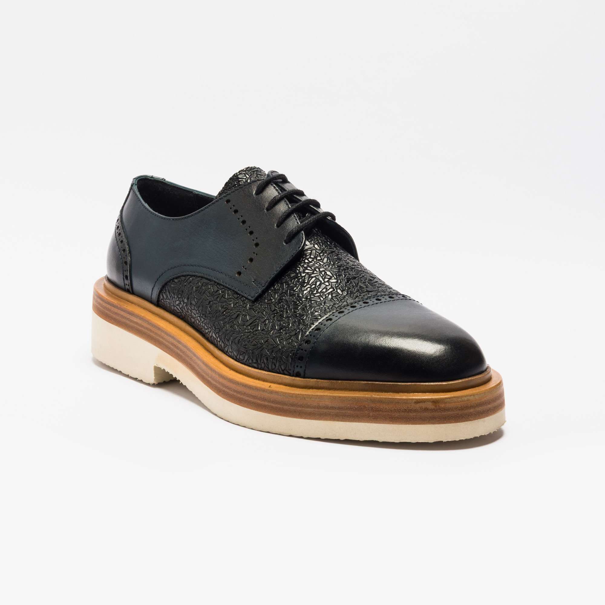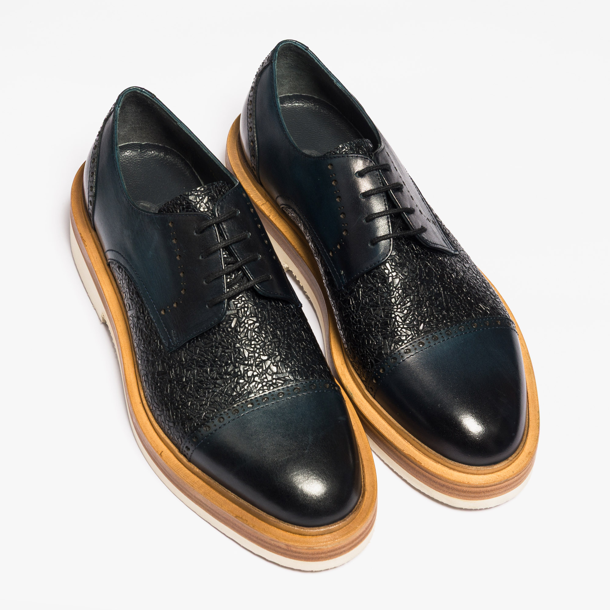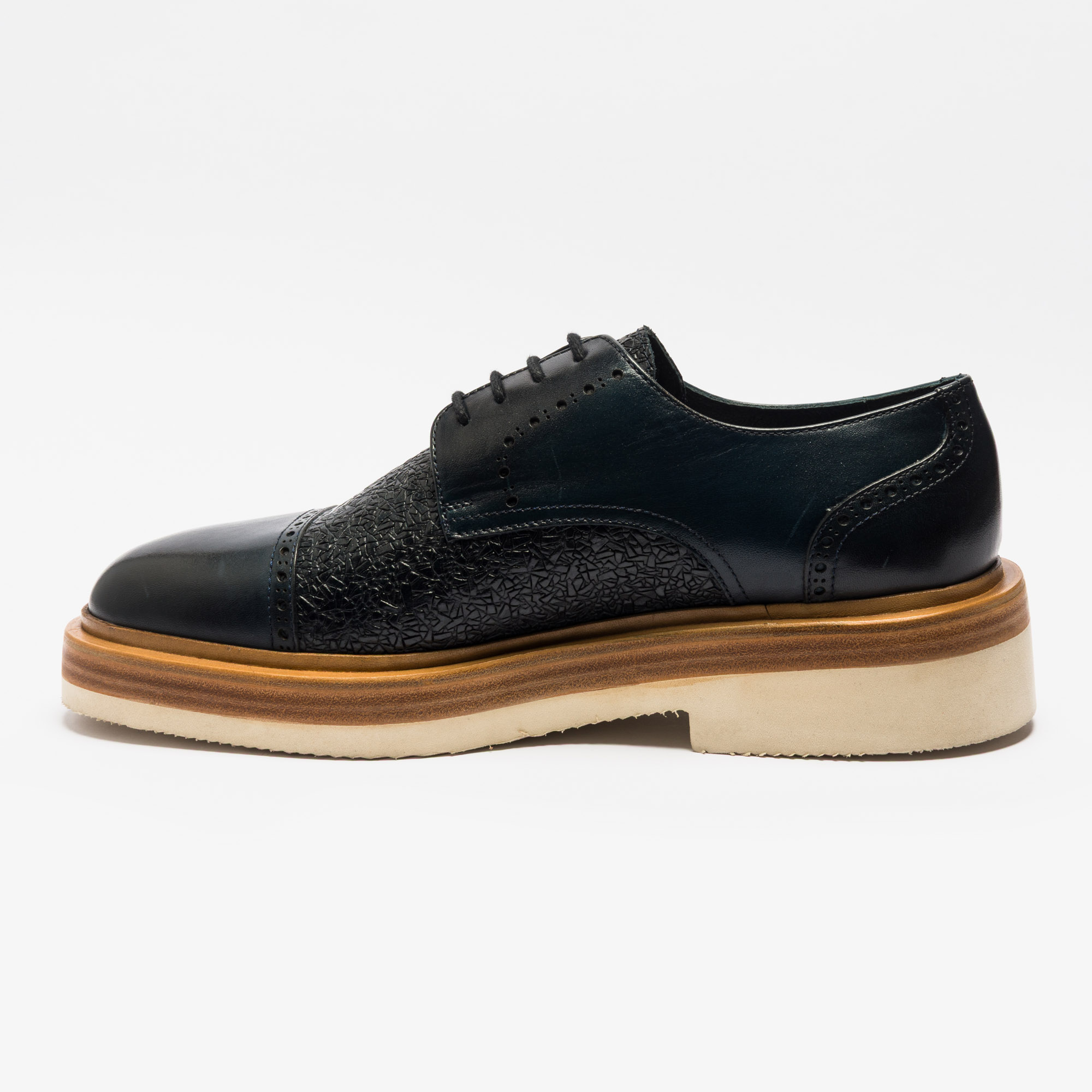Experience a perfect blend of classic elegance and contemporary design with these navy textured leather formal Derby shoes featuring a striking layered sole. Crafted for individuals who appreciate high-end detailing, this shoe stands out with its unique combination of smooth leather and intricately patterned textured leather on the upper. The traditional lace-up Derby construction adds timeless sophistication, while the subtle brogue-inspired perforations along the edges elevate the style even further.