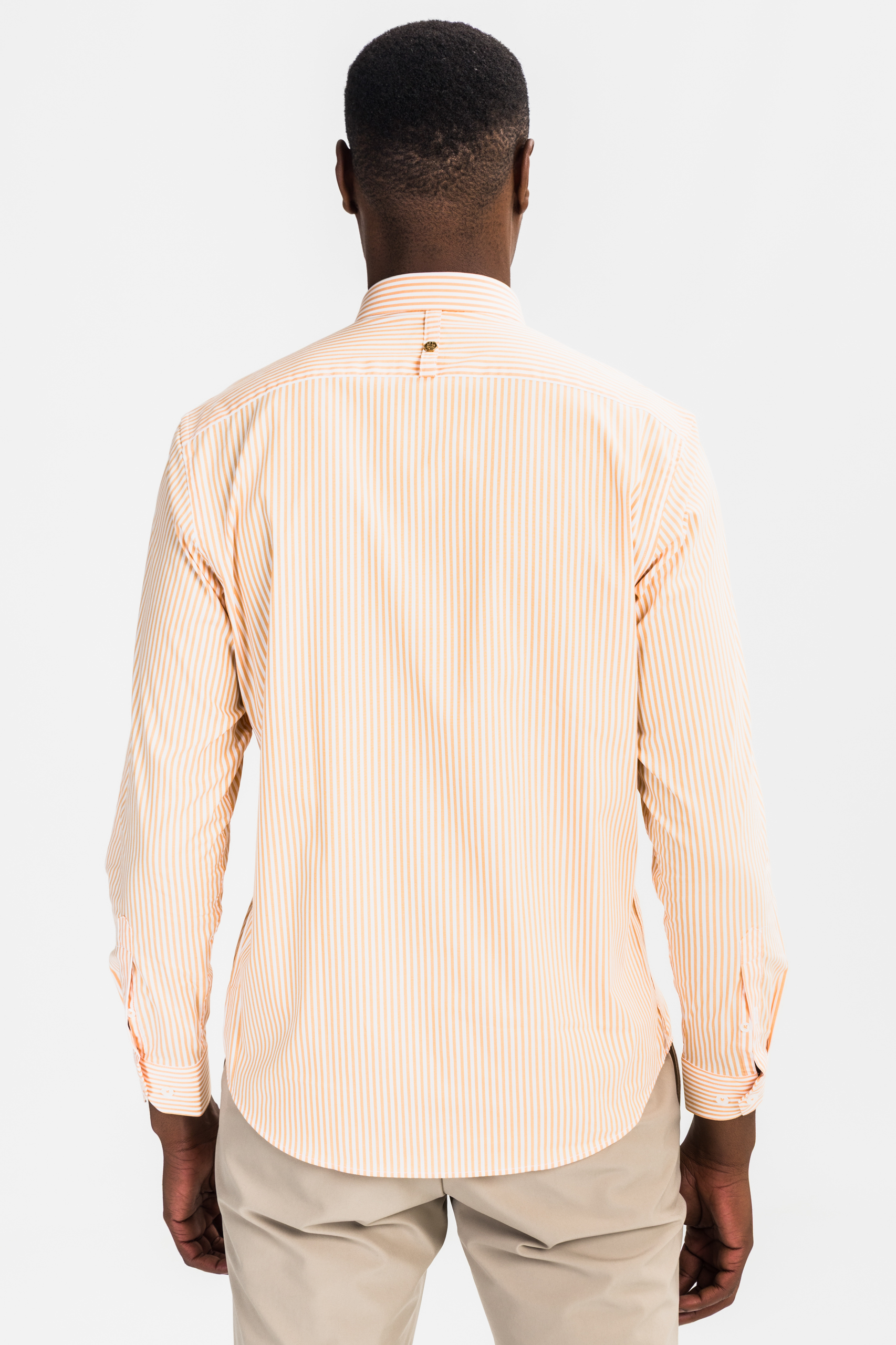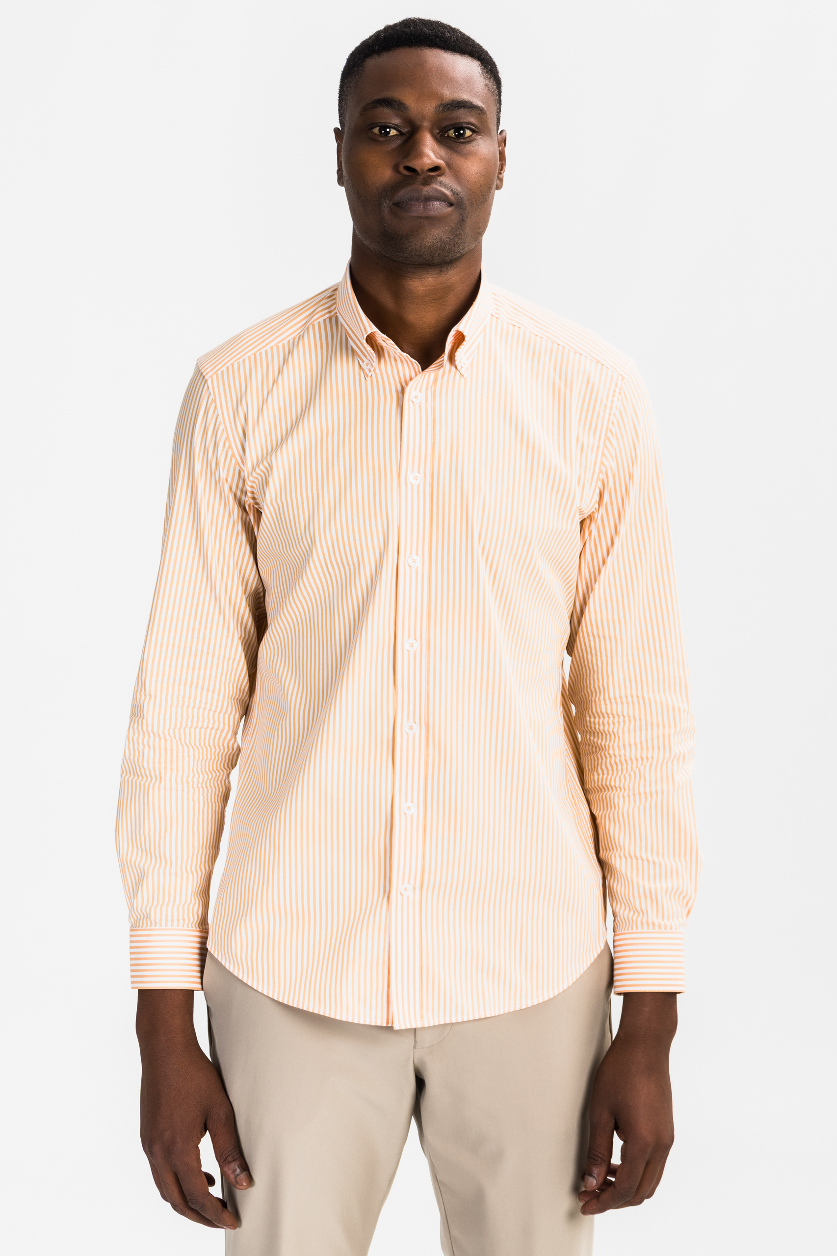 men’s orange and white striped button-down shirt, long-sleeved cotton oxford shirt for men, stylish striped office shirt, smart casual men’s oxford shirt, breathable cotton striped shirt, men’s formal and casual shirt, versatile orange striped shirt for men, easy-care long-sleeve oxford shirt