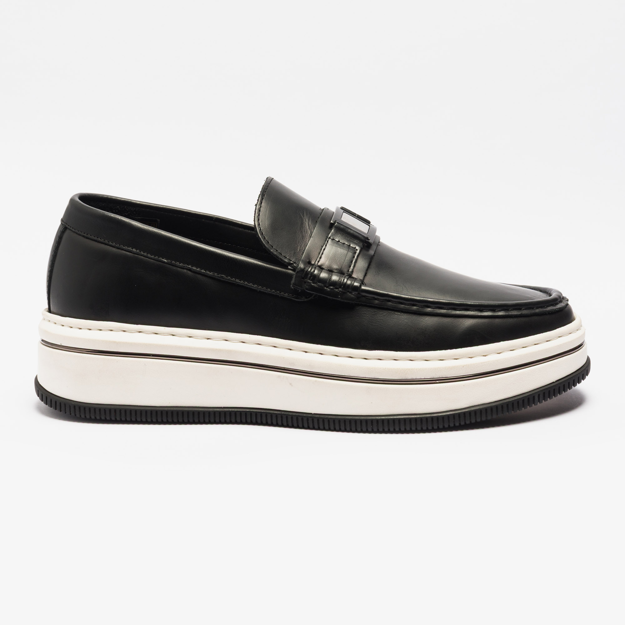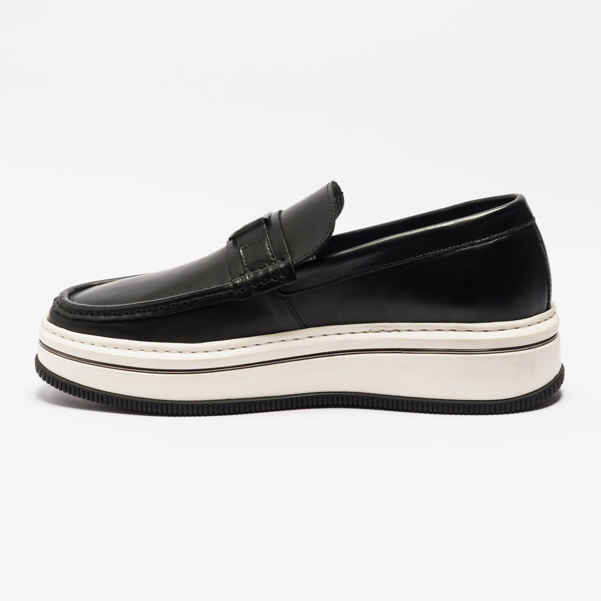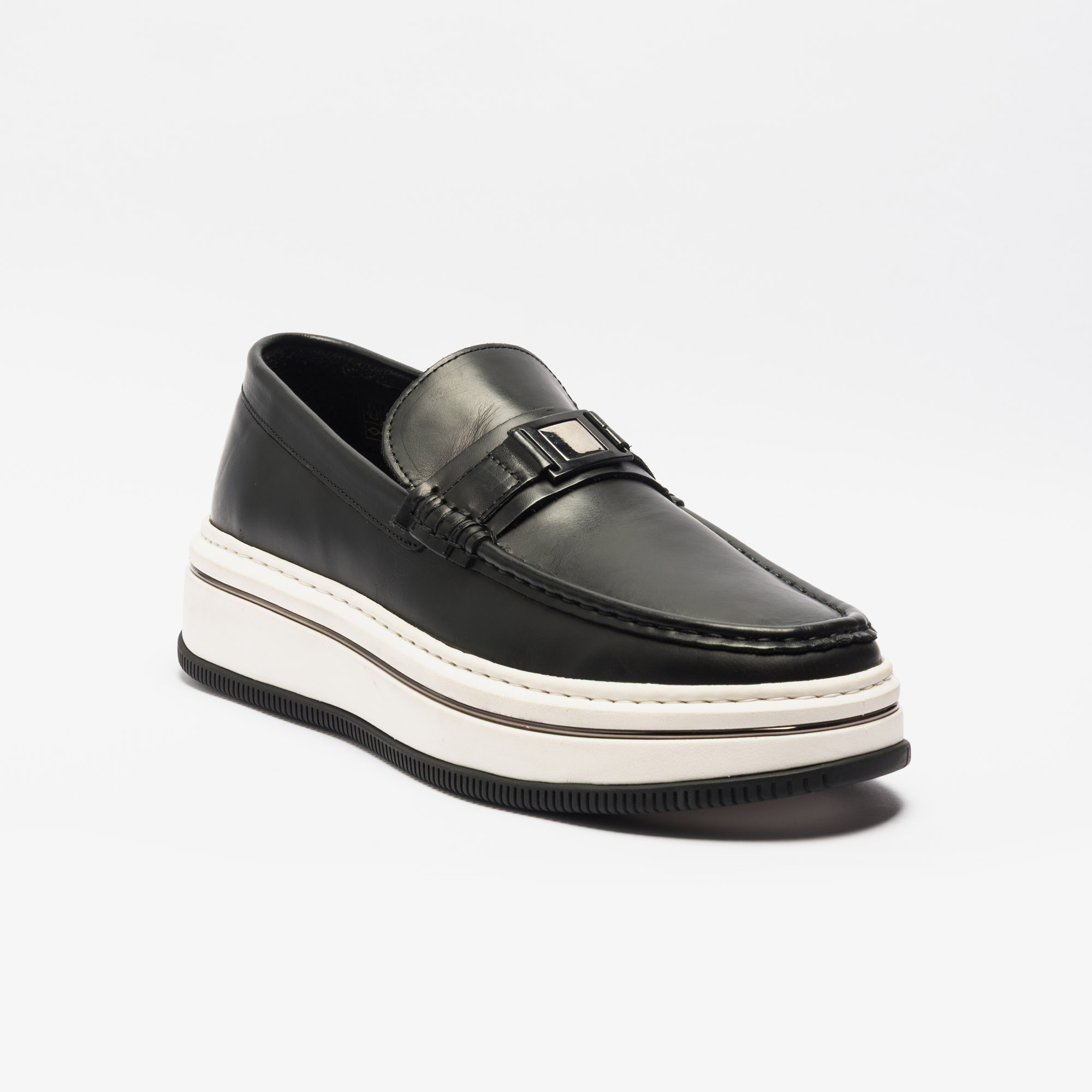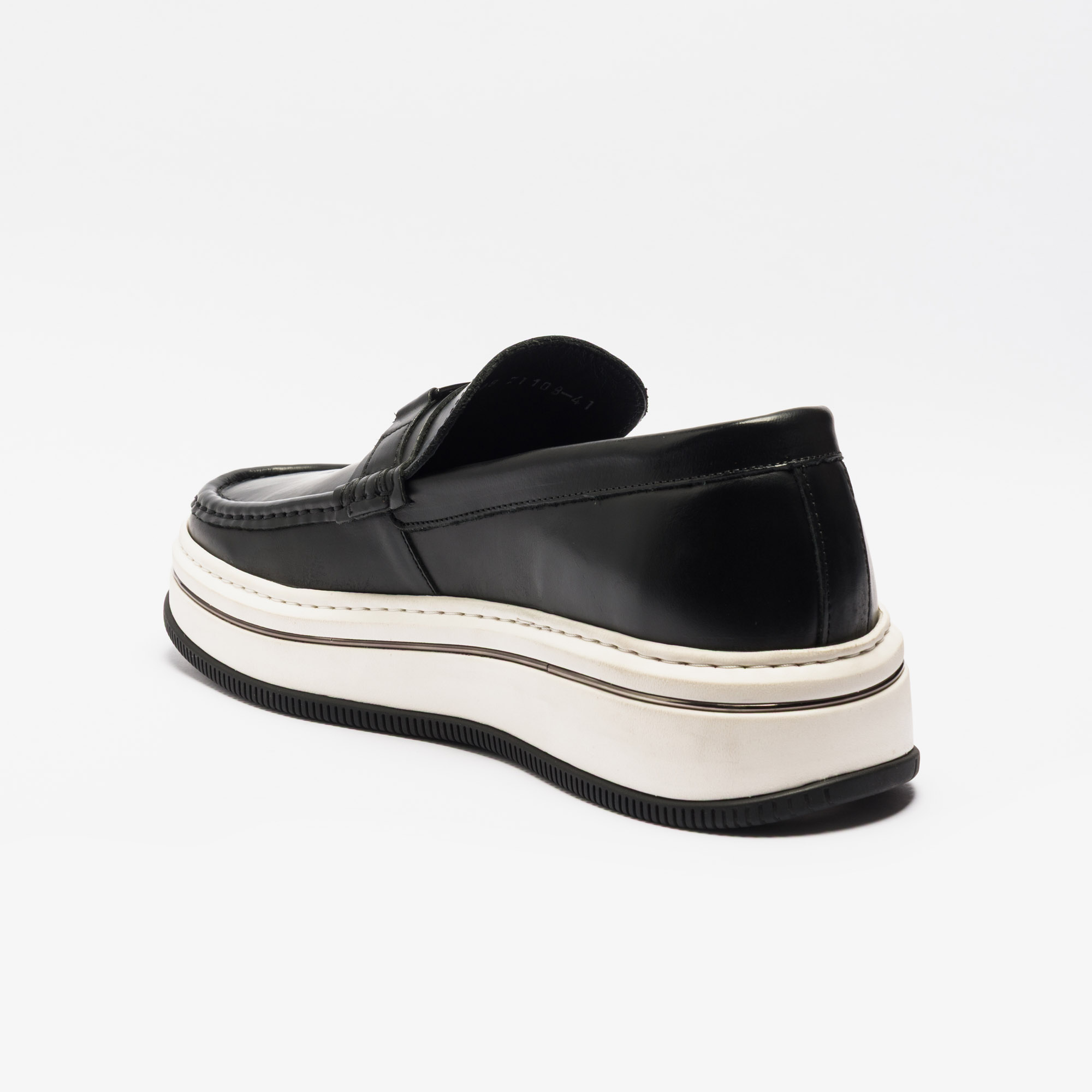 black leather loafer for men, loafer with elevated white sole, modern men’s casual leather loafer, premium black slip-on shoe, contrast sole men’s loafer, stylish black loafer for formal and casual wear, durable leather loafer with thick sole, men’s designer loafer with white bottom, comfortable everyday leather loafer, luxury black loafer for office and outings