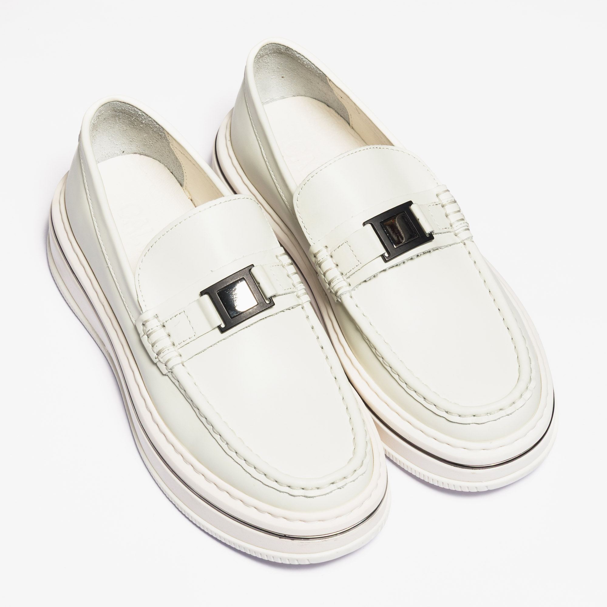 white loafers with buckle detail