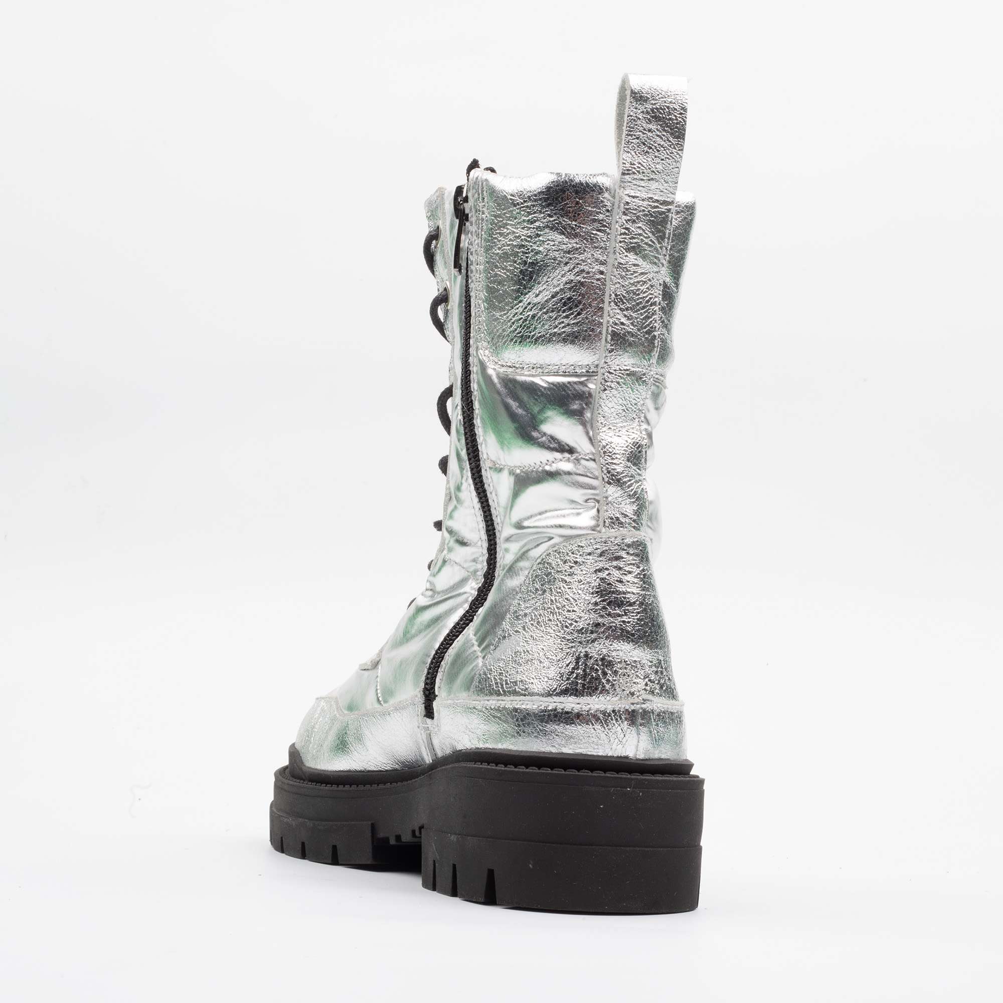 These silver combat boots for women are not just about looks; they are also practical and comfortable, with a padded interior that offers all-day comfort. The lace-up closure ensures a customized fit, while the pull-tab at the back makes them easy to slip on and off. If you’re looking for the perfect balance between cutting-edge fashion and everyday practicality, these silver boots are a must-have for your winter shoe collection.