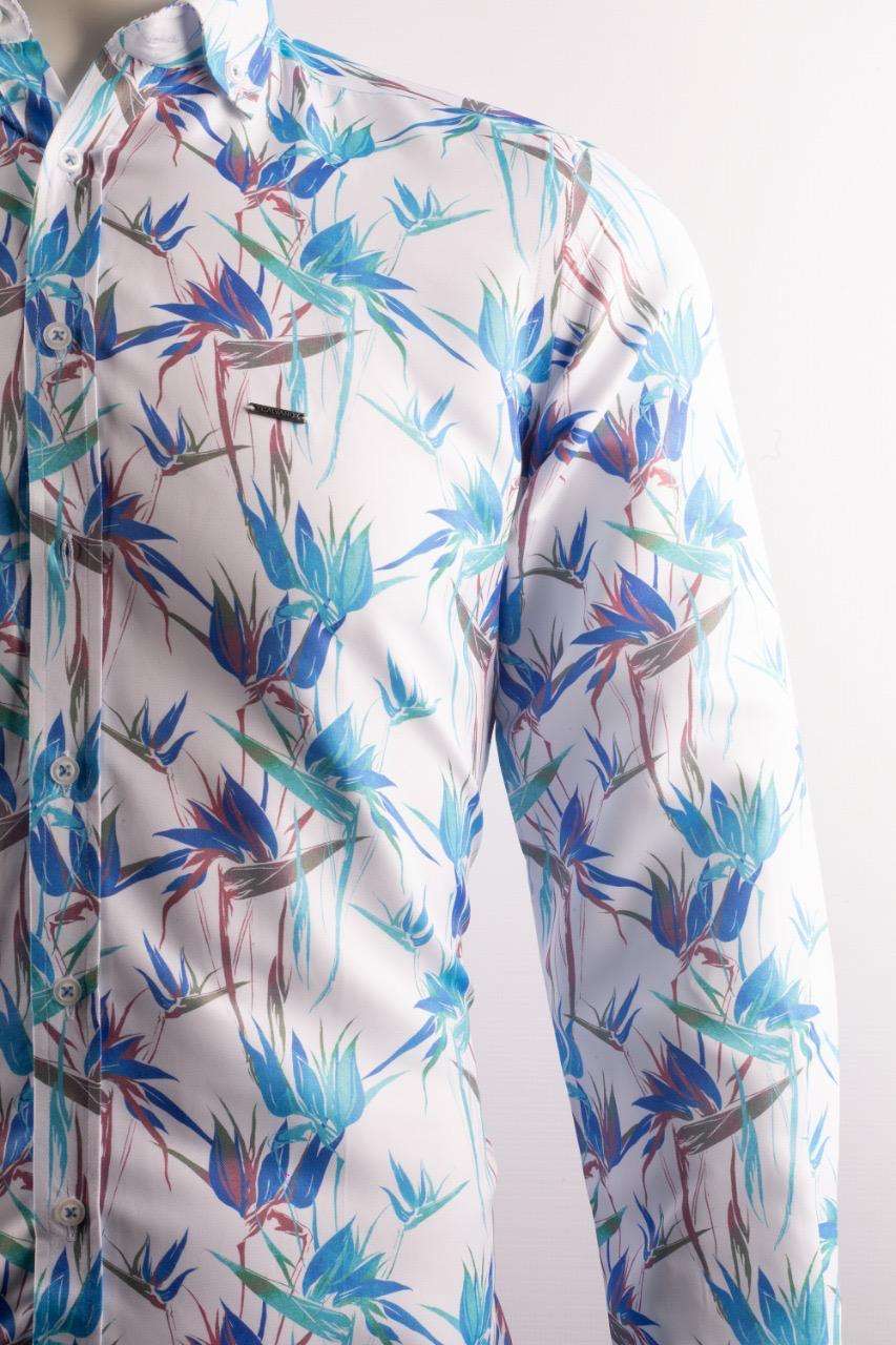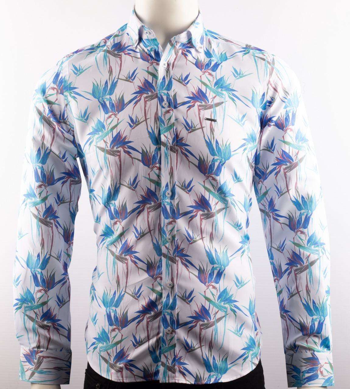 Crafted from lightweight, breathable fabric, this Men’s Floral Print Shirt ensures you stay cool and comfortable all day long. Its slim-fit tailoring offers a sharp, modern silhouette that complements a variety of body types, making it a versatile addition to your wardrobe. The vibrant floral pattern features shades of blue, green, and subtle hints of red, adding a splash of color without overwhelming the overall design.