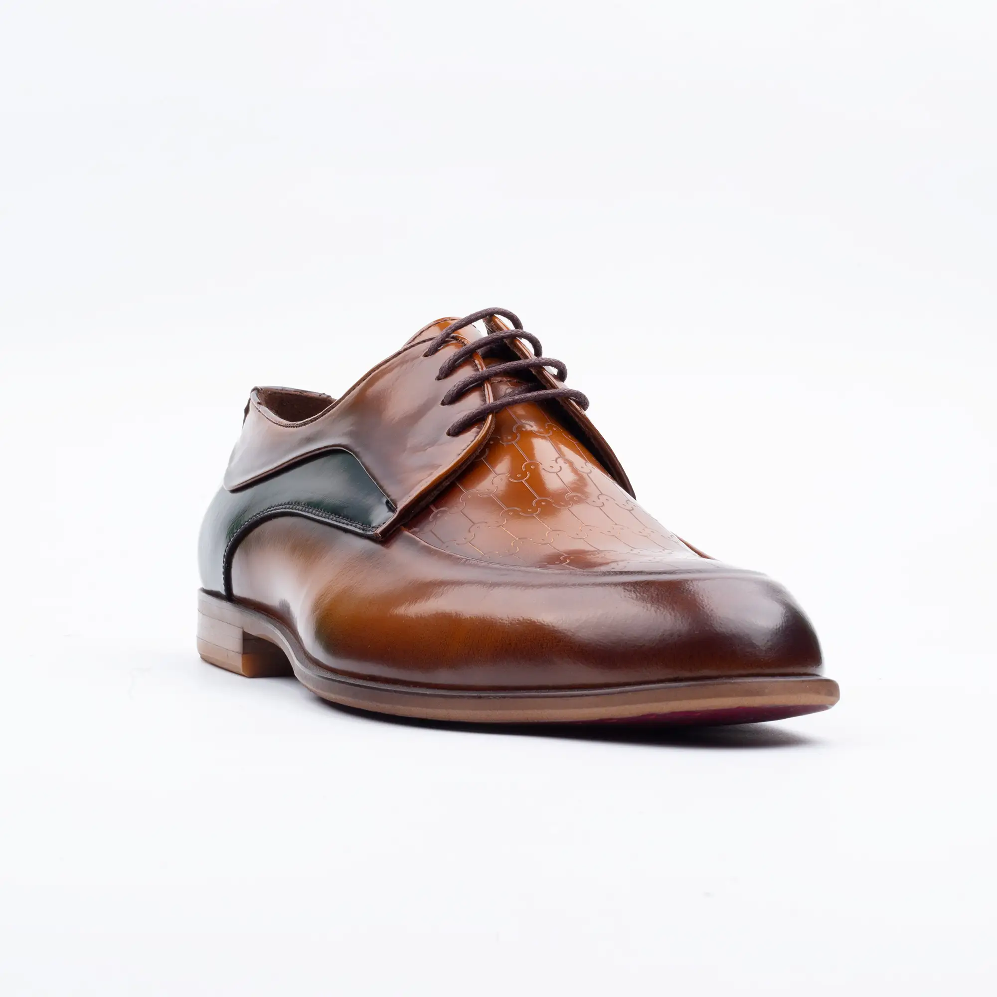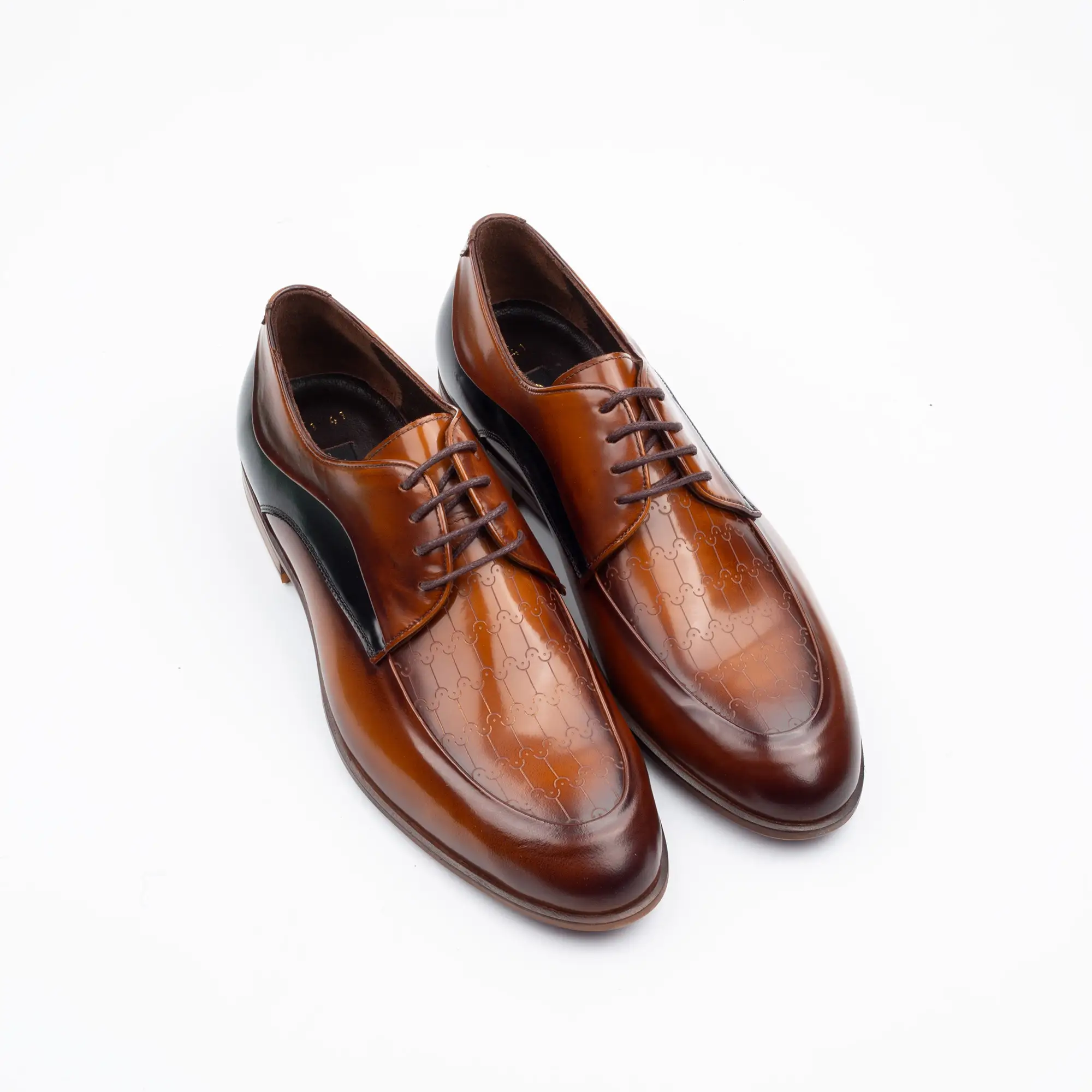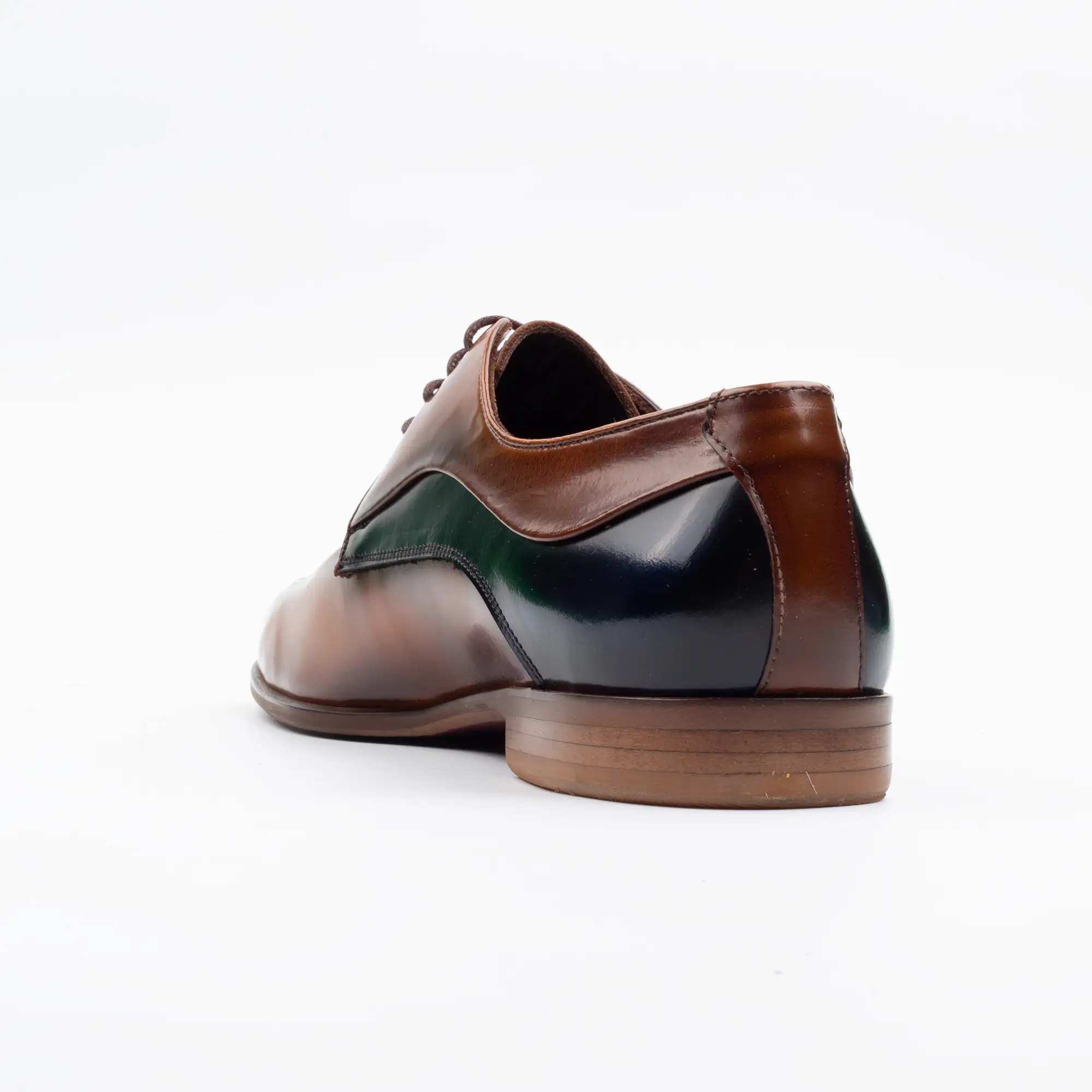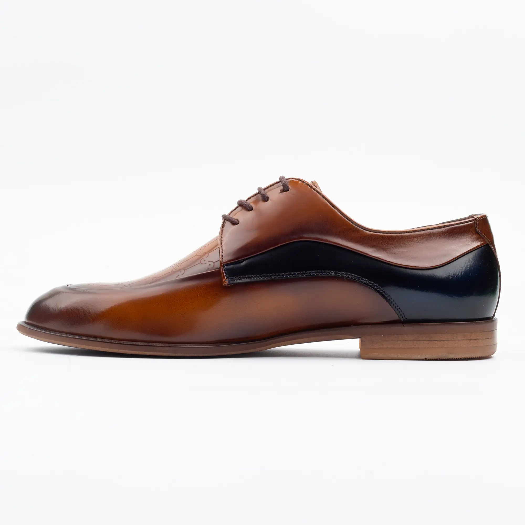 As an industry leader in luxury footwear, Calvano utilizes only the finest genuine leather, ensuring a product that matures beautifully over time. The striking contrast between the burnished tan and deep brown leather provides a contemporary twist on the classic derby silhouette.